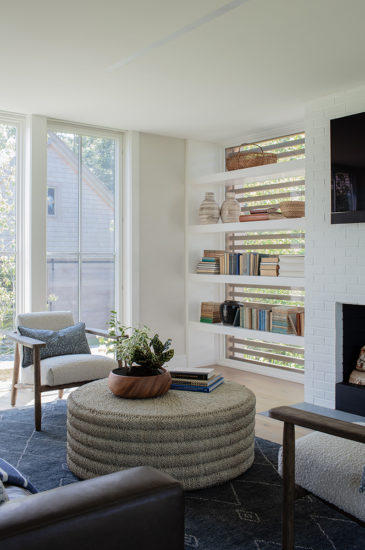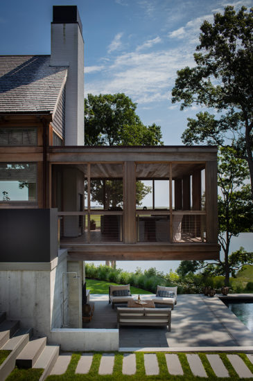 This Duxbury home, perched on a hill overlooking the tidal salt marshes, required unique solutions to achieve the homeowner’s desired program while speaking to the scale and vernacular of historic homes in the area. While its street facing side presents as a modest single-story home, the transparent main entry door begins to break with tradition, giving a glimpse of the experience inside – a rear wall is that is fully glazed on two stories, with panoramic views and a garden that opens onto a generous back lawn. The great room culminates in what is perhaps the home’s most striking feature – a cantilevered screen porch that extends 16’ over the pool terrace, enabling a single cube of lot coverage to serve as both shaded exterior space with unobstructed views, and also an interior space that feels as if it’s floating in the trees. Intentional terracing across the landscape creates gardens and varied zones for outdoor activity.