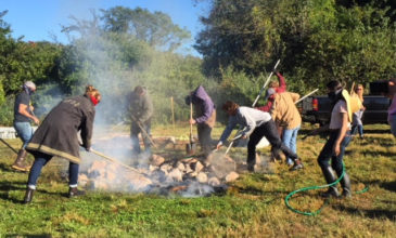 The bake starts a week before the big day; ordering food, collecting friends to help, gathering pallets for burning, and digging up equipment for serving, display and ambiance. The site of the clambake shifts from various friends’ (or parents’) back yards. The bake is always in an open field off in the woods, a perfect spot for camping and debauchery. The night before, out-of-towners converge at one of our homes and we prep and cook the stuffed quahogs. Early the morning of the bake, we build a bonfire over a bed of round, cannonball- like stones. As the fire heats up, our chowder starts to cook and the crew heads to the River to collect rock weed. With a truck bed full of rock weed we head back to the bake site for set up, all the while stoking the fire. Parents and kids trickle in all afternoon, and at 4:00 we prep to face the coals, dressing up in our fireman jackets, handkerchiefs, gardening gloves and boots.