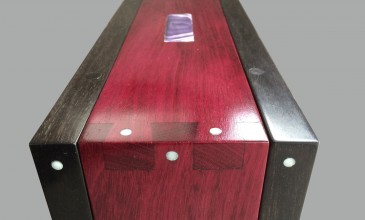 For the box lid, Frank used a material called purple heart. This once-abundant wood, sourced from amaranth trees, is known for its qualities of toughness and endurance. In the mosaic pattern on the front of the box, one can discern an ocean wave of purple wampum, echoed below with the start of another.