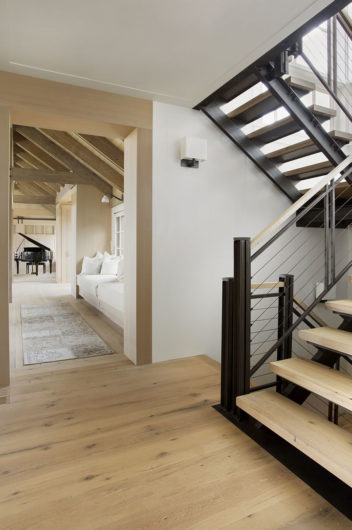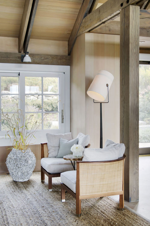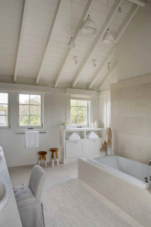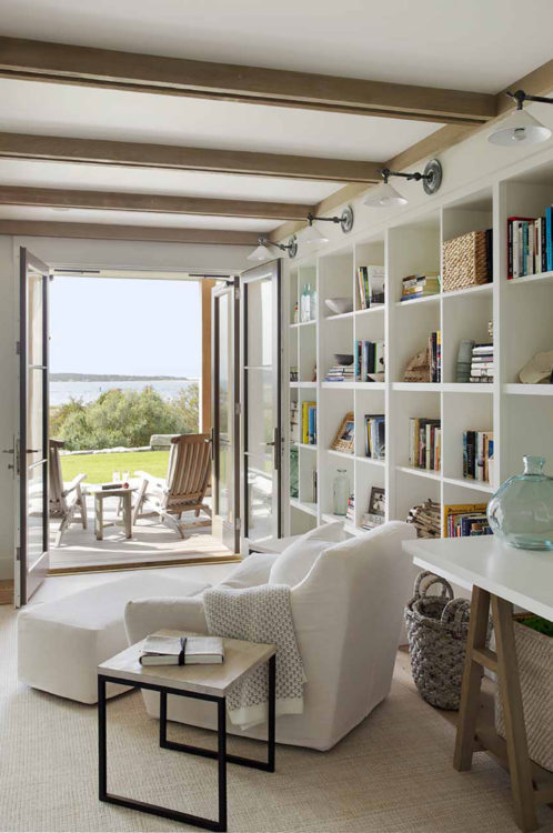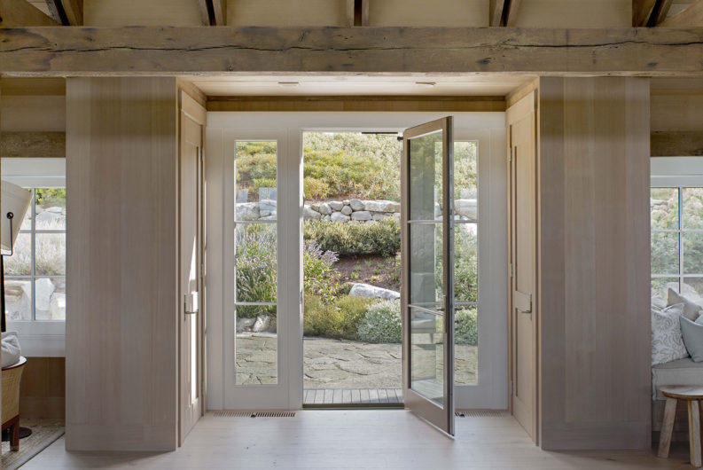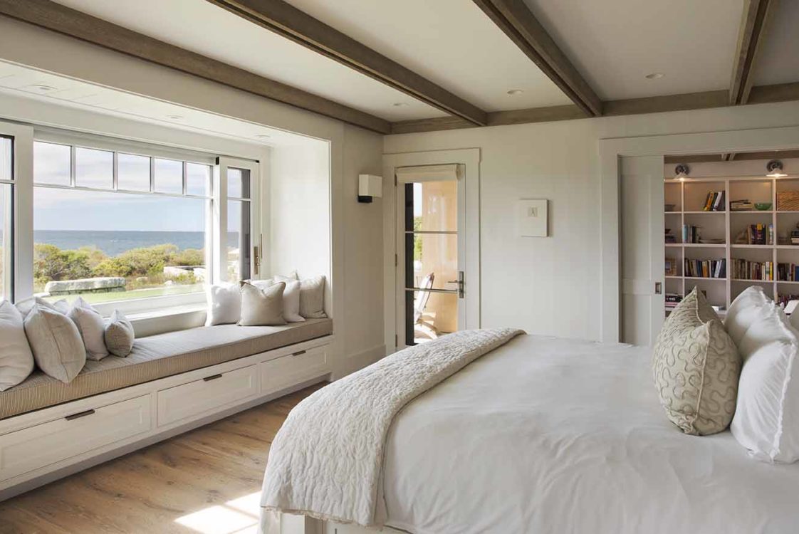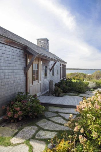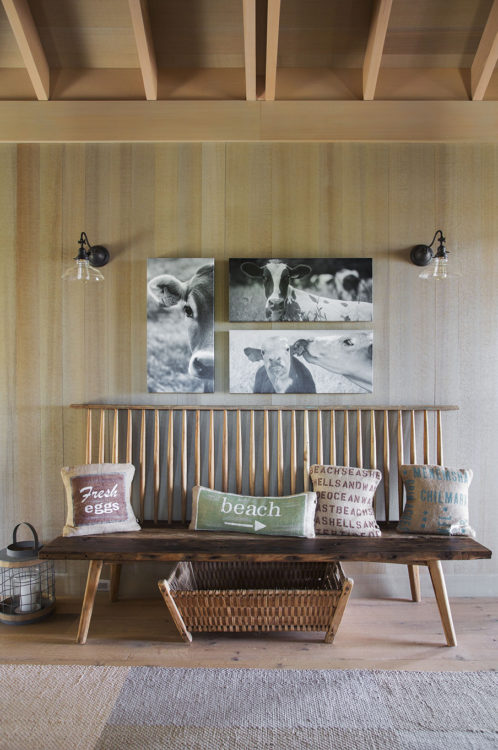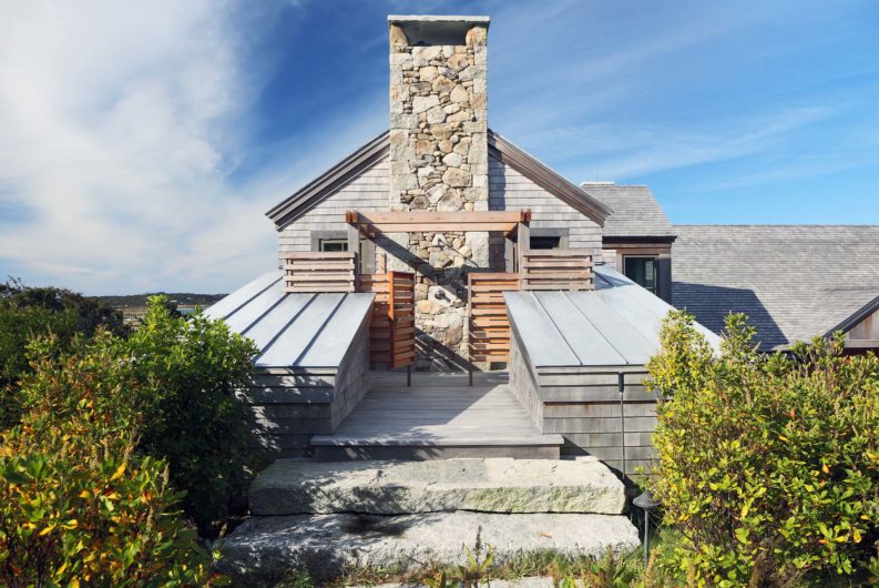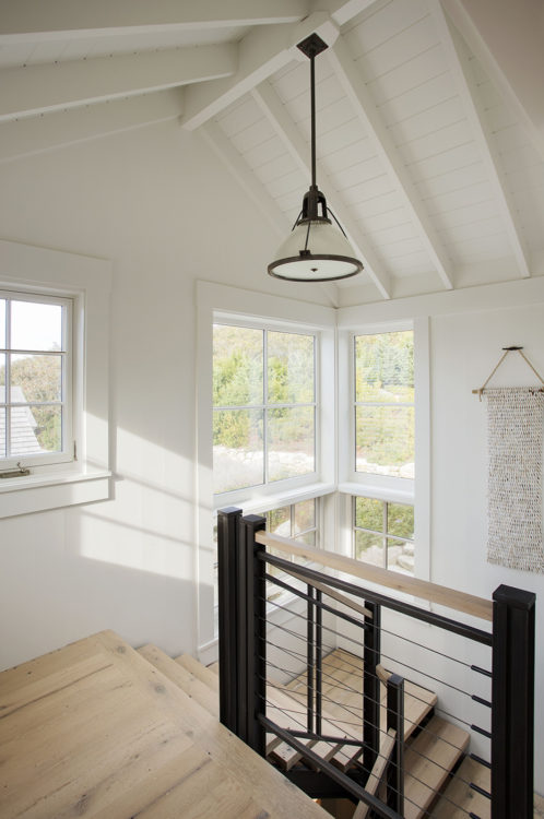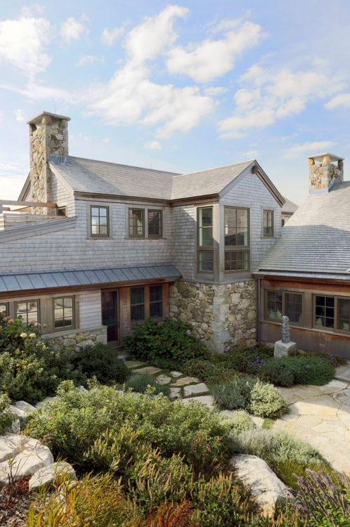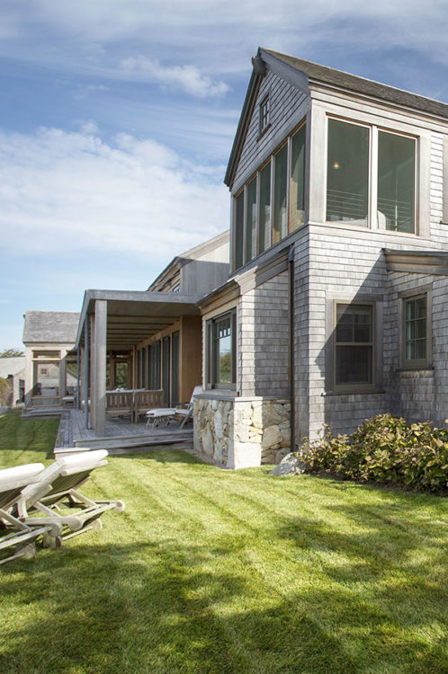 This summer beach house was designed for a family with three children. The plan includes large gathering spaces inside and out, as well as smaller spaces for quiet and relaxation. The hub of the home is a vaulted living space which combines dining, sitting, and music spaces in one central open pavilion. Large windows invite nature into nearly every room, from a wall of sliding windows connecting the kitchen to an herb garden to the master bedroom, which opens fully on one side to a screen porch balcony. Driftwood tones and barn-like details on the interior marry the naturally-weathering cedar façade, giving this home a relaxed elegance that welcomes visitors from the beach beyond.