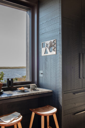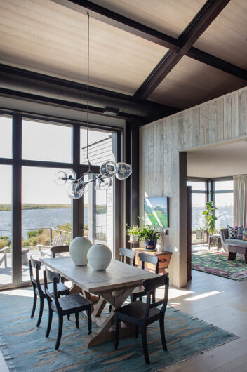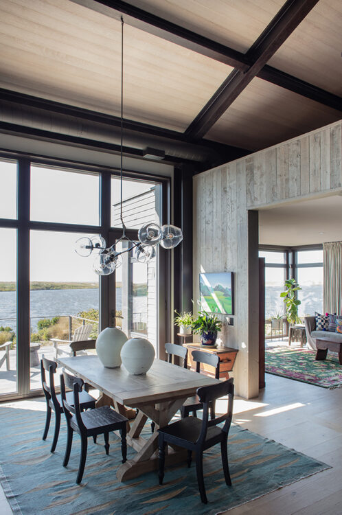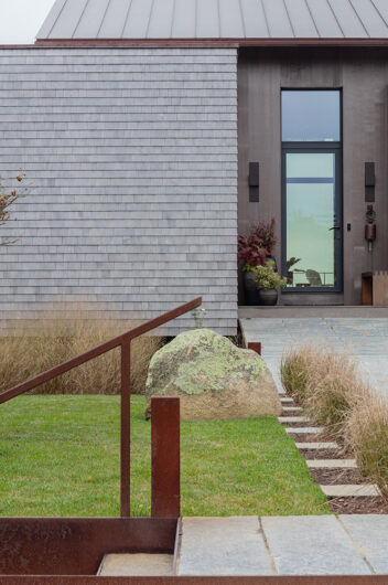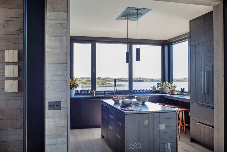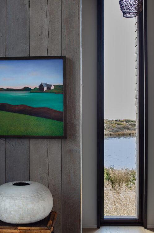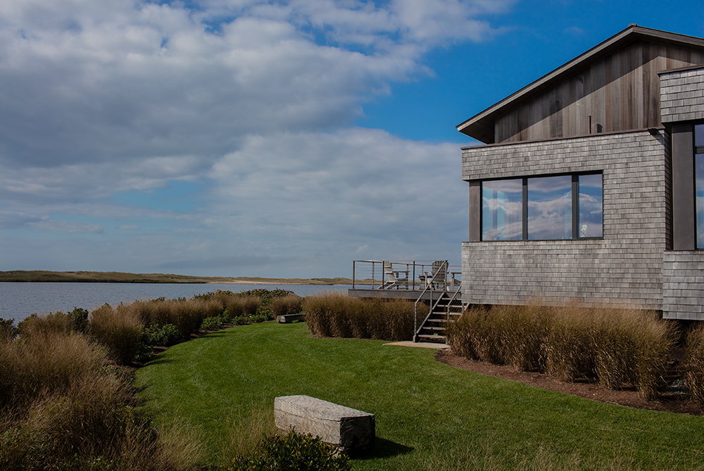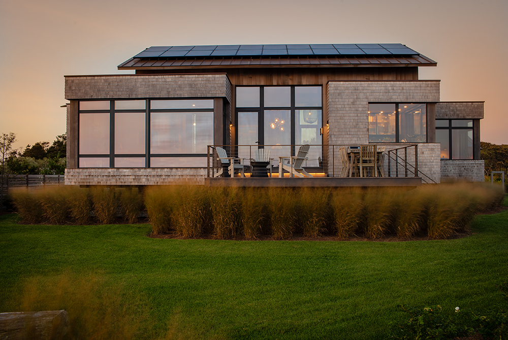Nestled forward on a waterfront site and fitting within strict wetland setbacks, this Martha’s Vineyard home strikes the perfect balance between maintaining a strong connection to its natural setting and maximizing privacy from neighboring properties. The main house is elevated five feet above the floodplain, allowing native vegetation to migrate up to and under the house. Visually and experientially, this feature creates a sense of floating, as movement within the grasses below create views straight through to the horizon. The desire for a compact, comfortable, and resilient home led the homeowners to pursue and exceed Passive House requirements. The Passive House Institute US places an extraordinary emphasis on indoor air quality, resilience, and an unparalleled indoor environment. With a robust solar electric system inclusive of battery storage, this home can operate entirely independent from the grid and use of fossil fuels, and generates enough surplus power that the homeowners can allocate extra to their adult children who live across town.