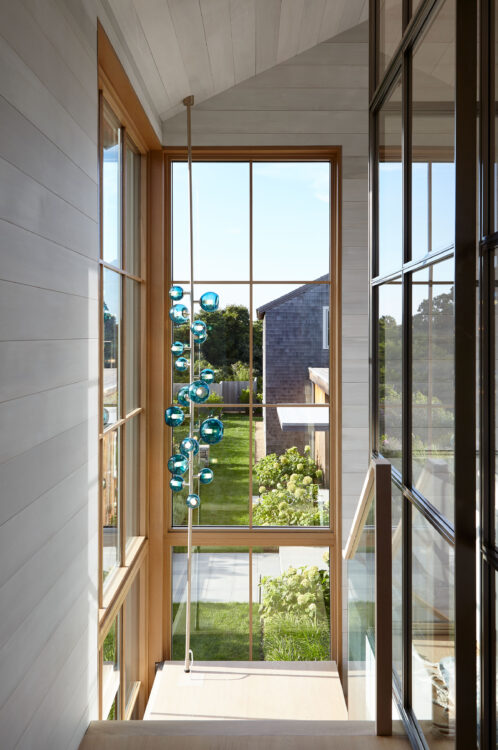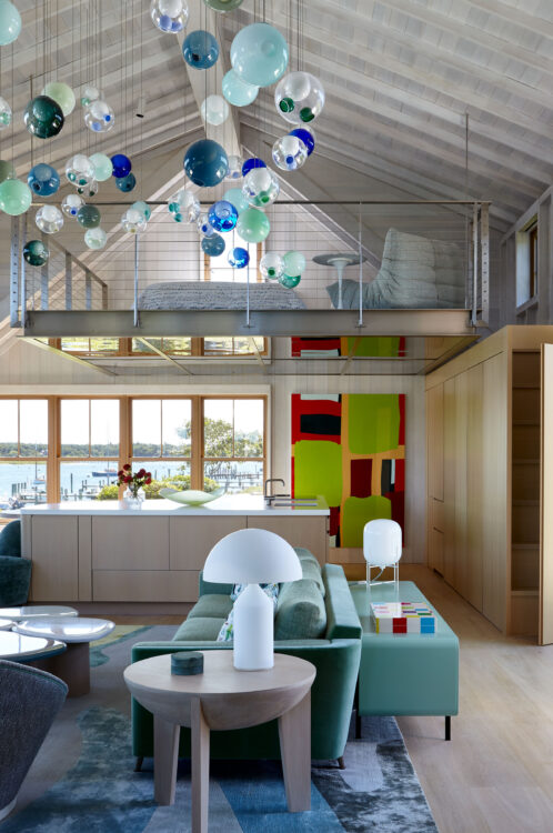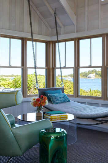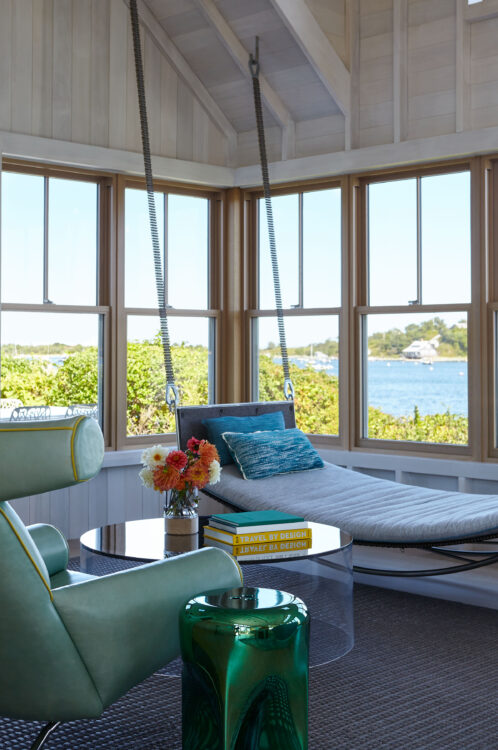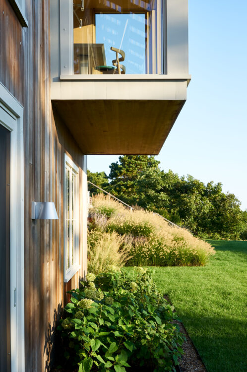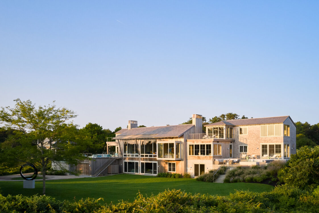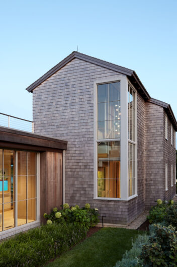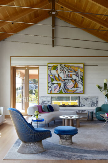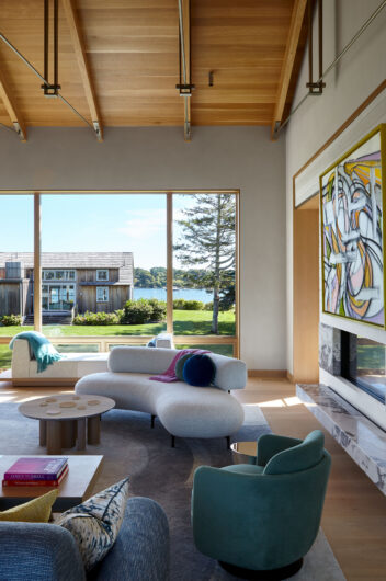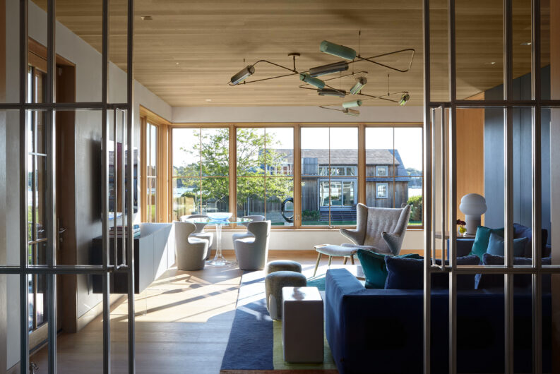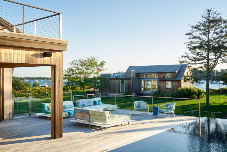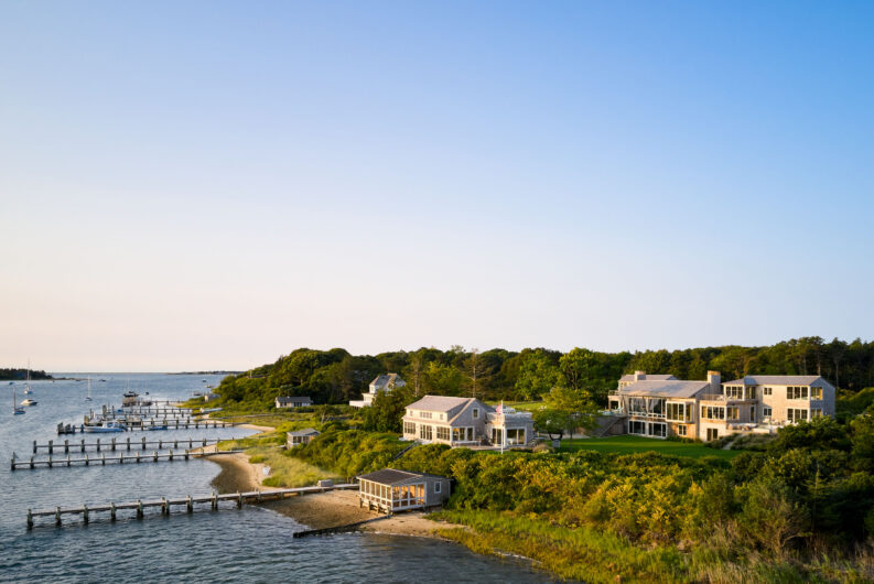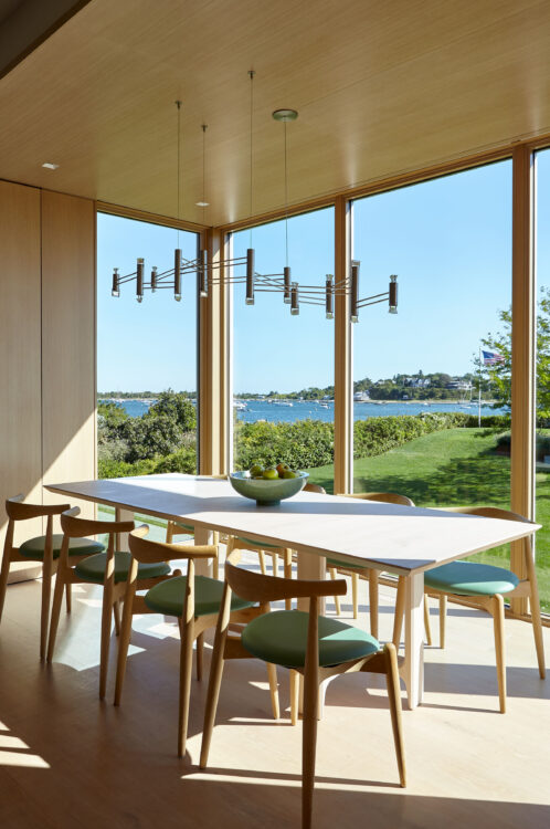 The main house is dedicated to entertaining an extended network of family and guests. Four “primary” suites extend to the corners, while a great room, kitchen and sitting room are centrally located with access to the main level pool deck. The life room includes a large, vaulted ceiling with asymmetrical “saltbox” roof form and two-sided fireplace opening onto the screened porch. Across the lawn, the cottage was re-imagined as a detached primary suite, granting the homeowners both autonomy and immediate engagement with the sea beyond. “Bluff Cottage” provides everything the homeowners might need when they are visiting alone or retreating from the day’s activities, while the main house provides amenities of a boutique inn, with large spaces for cooking, gathering, work and celebration – all with the privacy and convenience of its adjacent location, as well as access to activities along the shoreline, where an existing boathouse was refurbished to provide yet another layer of waterfront hospitality.