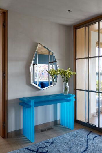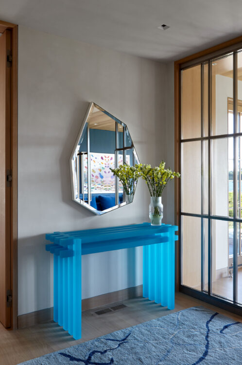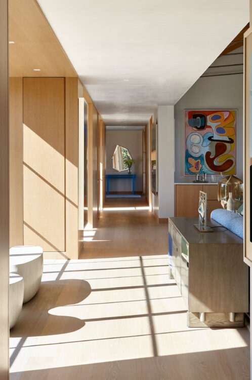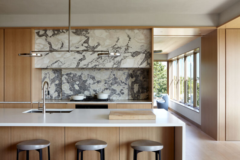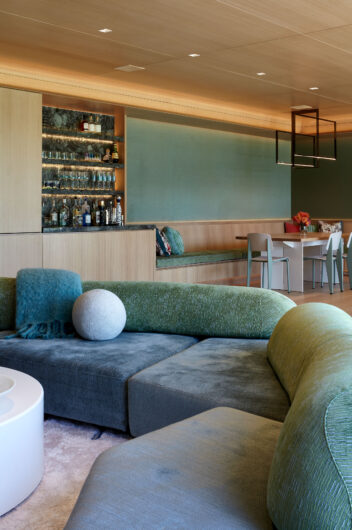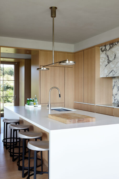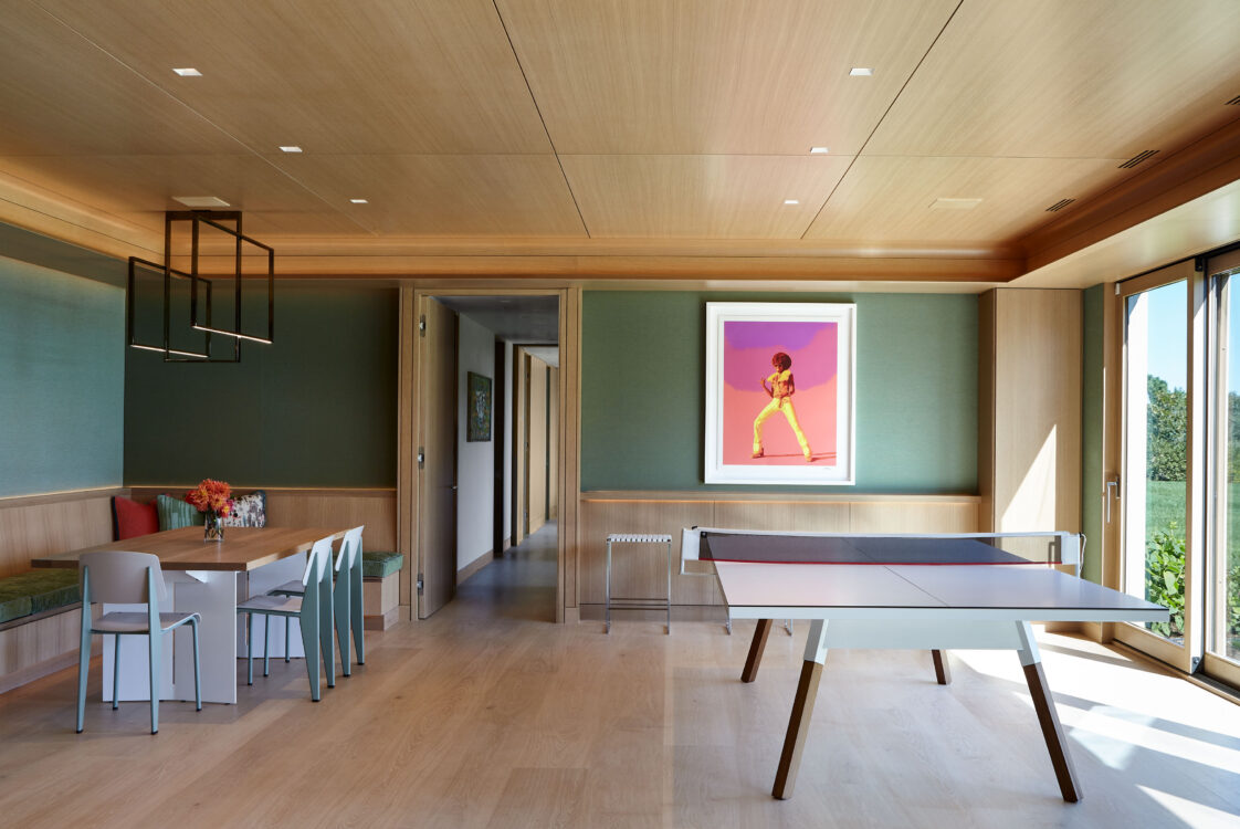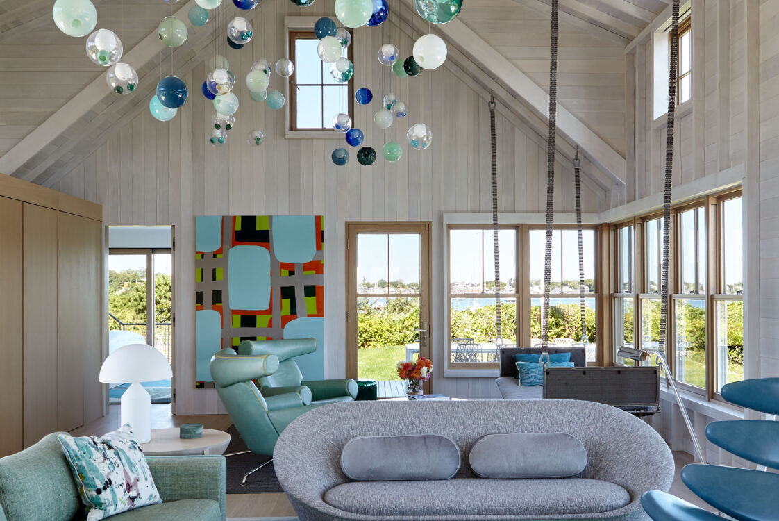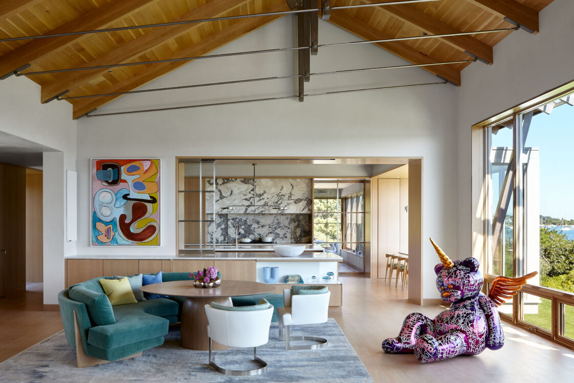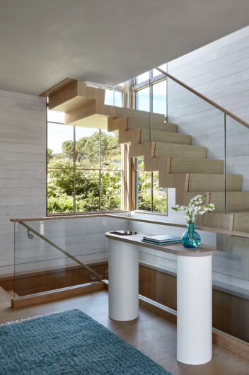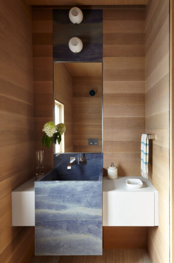 The main house is dedicated to entertaining an extended network of family and guests. Four “primary” suites extend to the corners, while a great room, kitchen and sitting room are centrally located with access to the main level pool deck. The life room includes a large, vaulted ceiling with asymmetrical “saltbox” roof form and two-sided fireplace opening onto the screened porch. Across the lawn, the cottage was re-imagined as a detached primary suite, granting the homeowners both autonomy and immediate engagement with the sea beyond. “Bluff Cottage” provides everything the homeowners might need when they are visiting alone or retreating from the day’s activities, while the main house provides amenities of a boutique inn, with large spaces for cooking, gathering, work and celebration – all with the privacy and convenience of its adjacent location, as well as access to activities along the shoreline, where an existing boathouse was refurbished to provide yet another layer of waterfront hospitality.