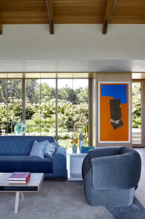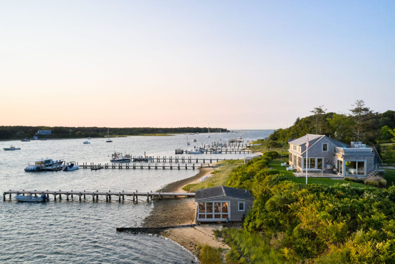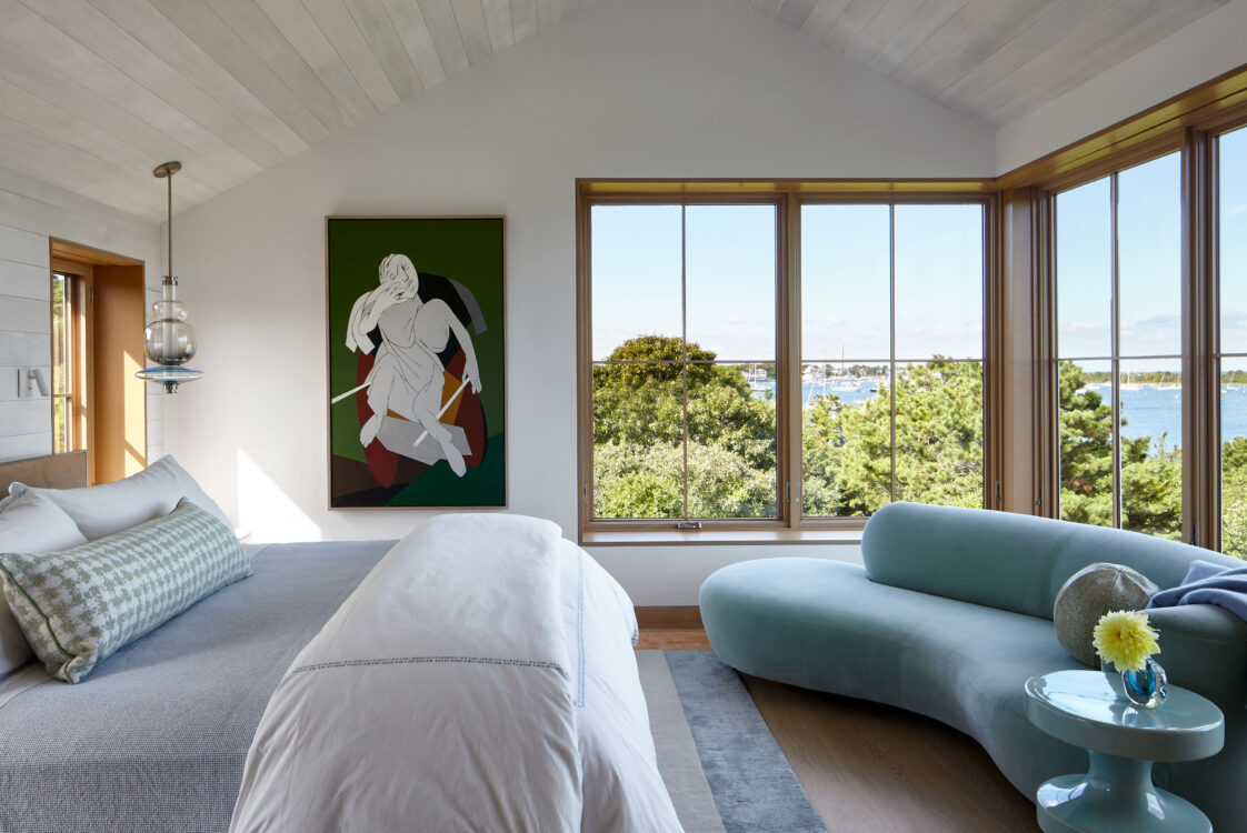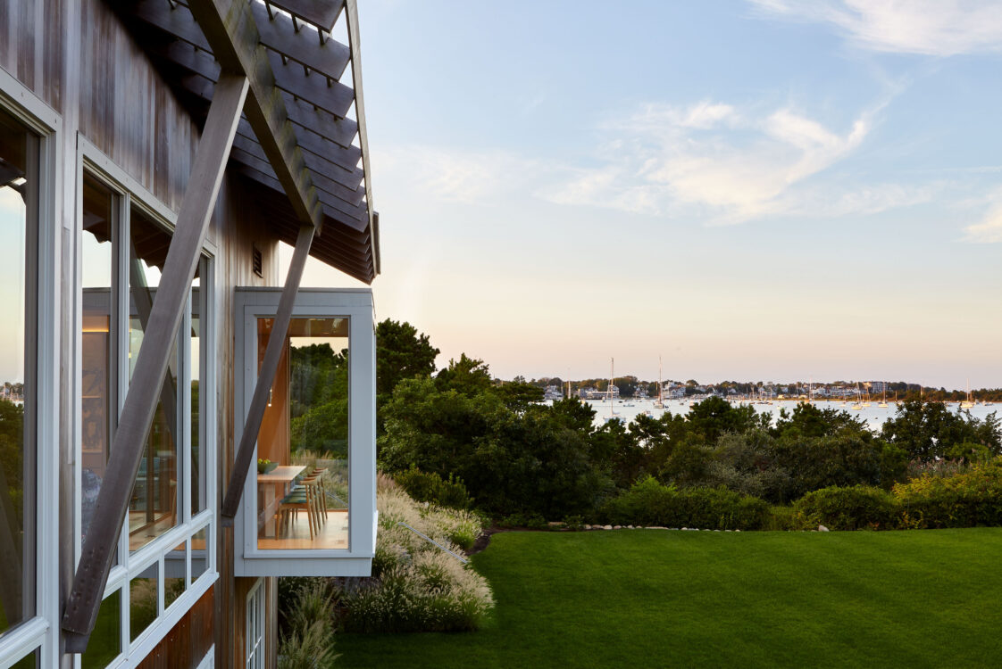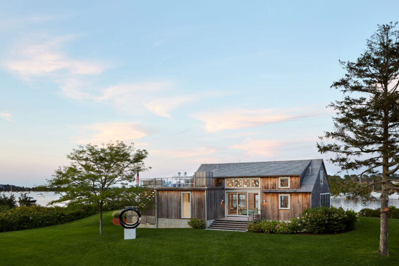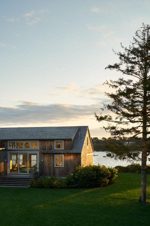 The homeowners of this waterfront site aimed to create a family compound, serving as a summer getaway for both older and younger generations. Complete with boat dock and ample space to spread out, their desired retreat, comprised of two primary structures, flips the typical orientation of the main house and guest house, with its smaller “Bluff Cottage” built directly on the view.