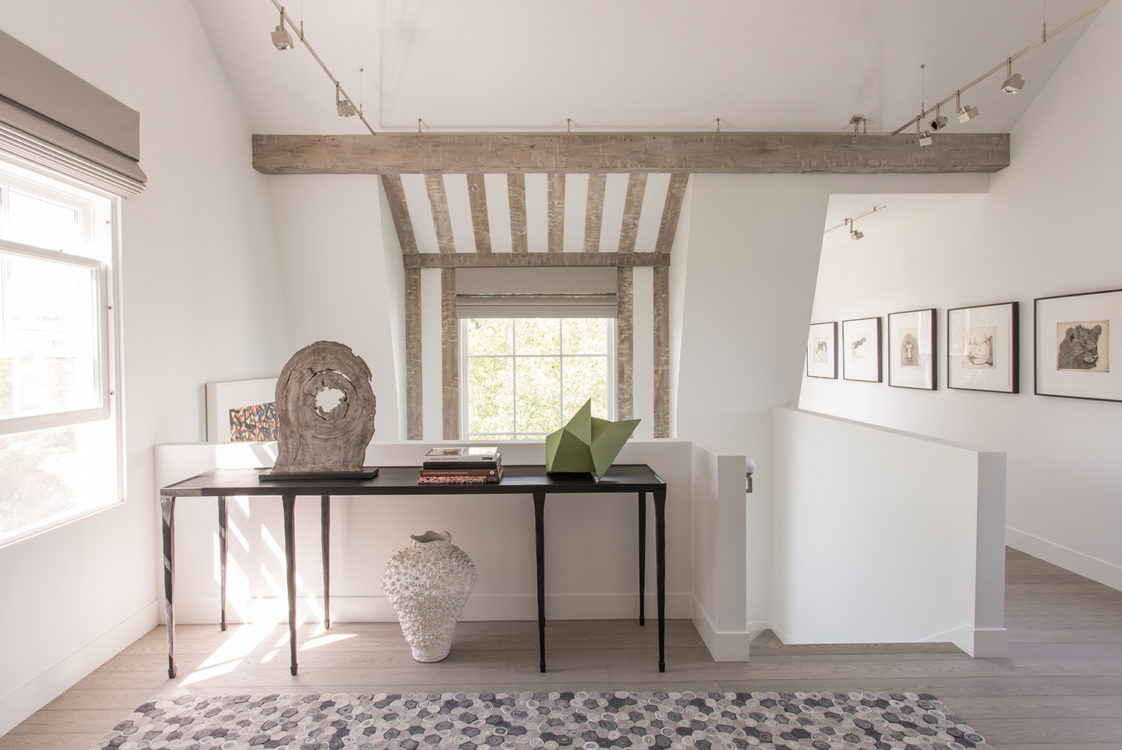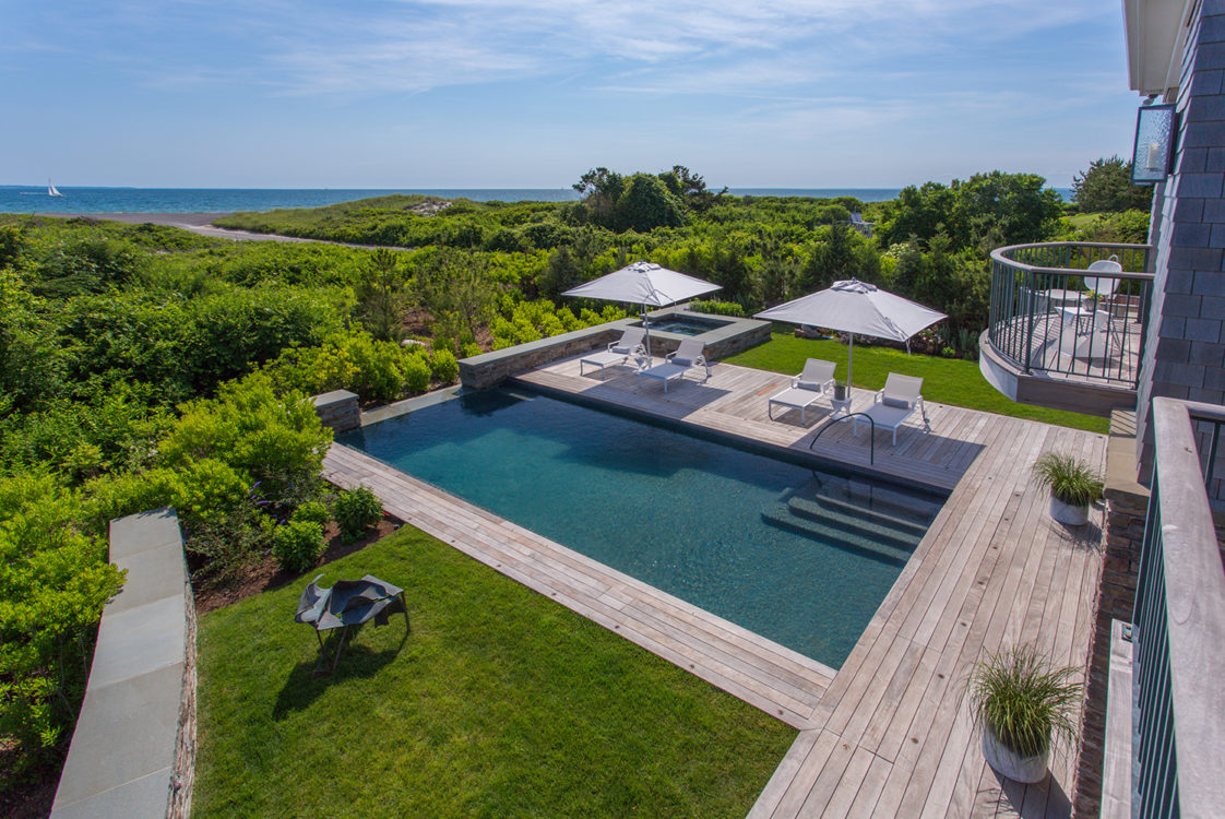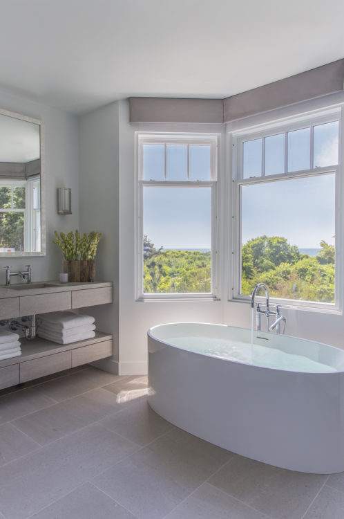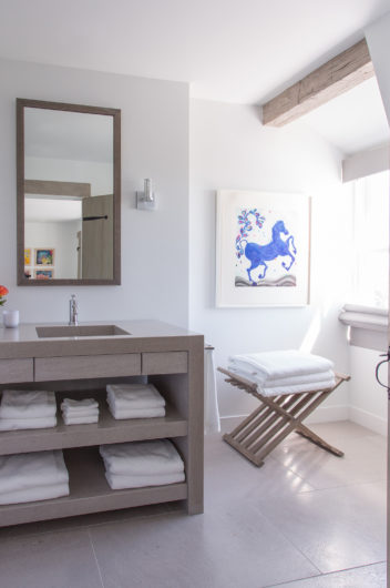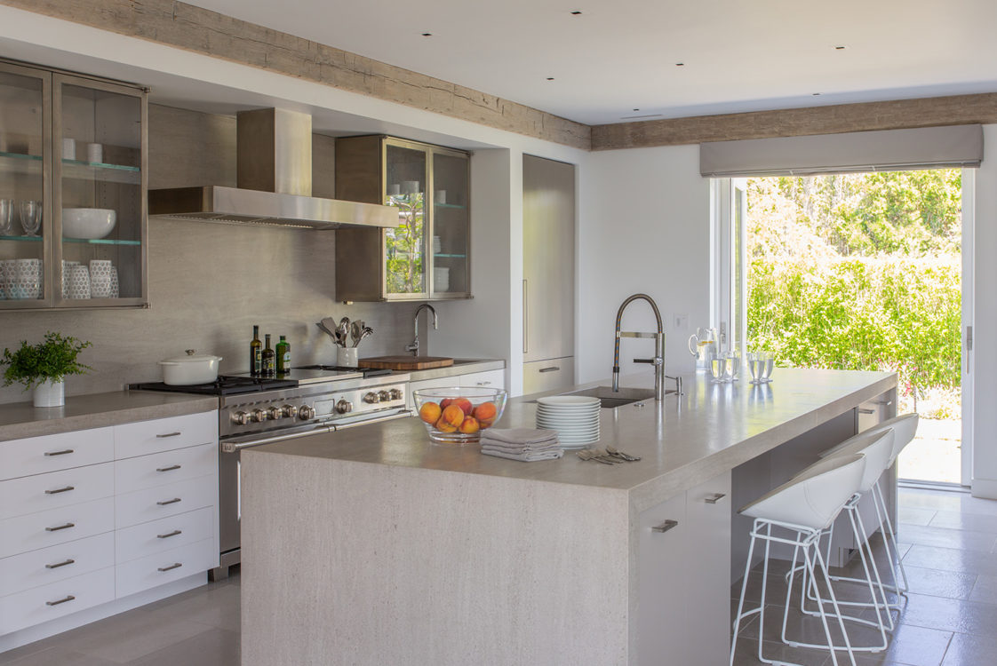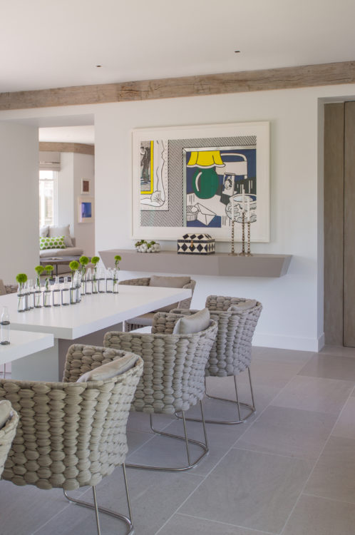 This homeowner wished for a house that spoke to the local Shingle Style tradition, but also felt open and comfortable for entertaining. Hutker Architects conceived a gambrel structure with two wings (one for family bedrooms and one for guests) arranged around a large central living area. Cottage style windows connect with historic homes in the area, inviting light from all four directions, while contemporary interior touches create an atmosphere suited to the family’s incredible modern art collection and active lifestyle.