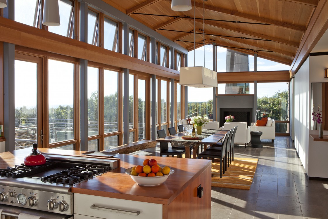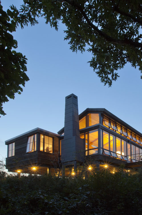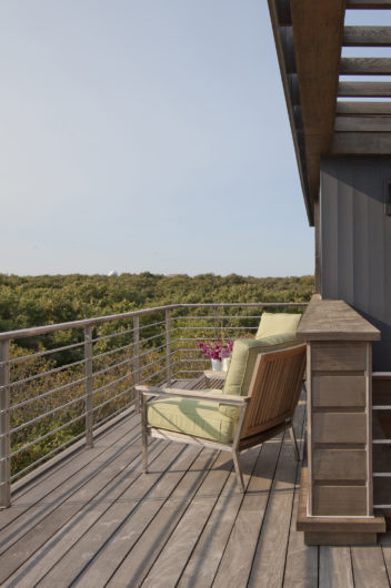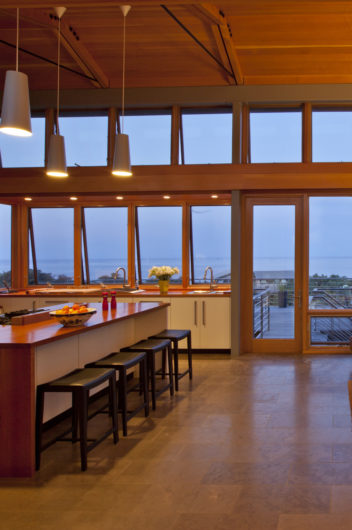 For this property hugging a cliff some 140 feet above the Atlantic, the client asked for a “tree house” – a structure set above the canopy of oaks and foliage – with an unobstructed ocean view. The home is zoned into three parallel linear volumes, clad largely in naturally weathered boards, glass, and copper. A long deck, inspired in form by a pontoon outrigger, is connected to the house by three bridges. The design elegantly weaves the legacy of midcentury modern architecture with the romance of the Cape Cod maritime tradition.