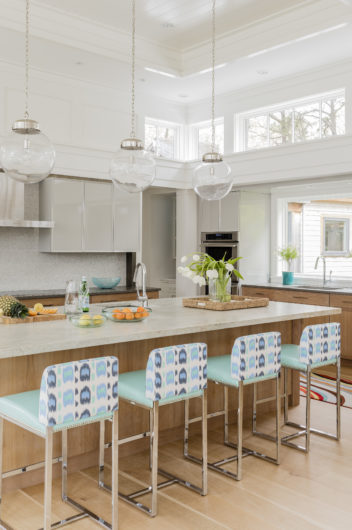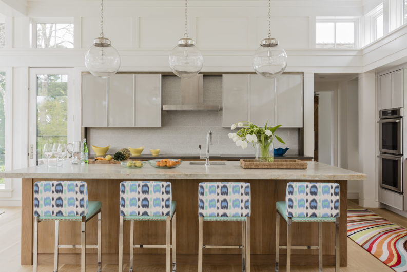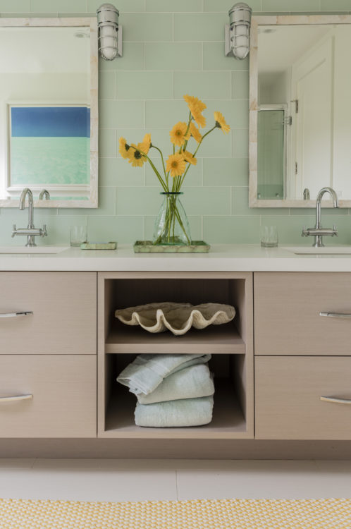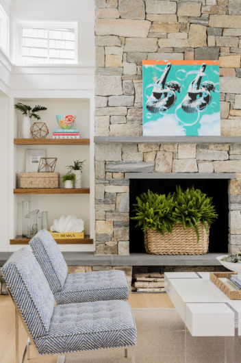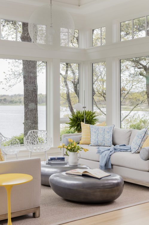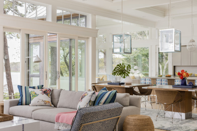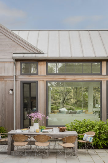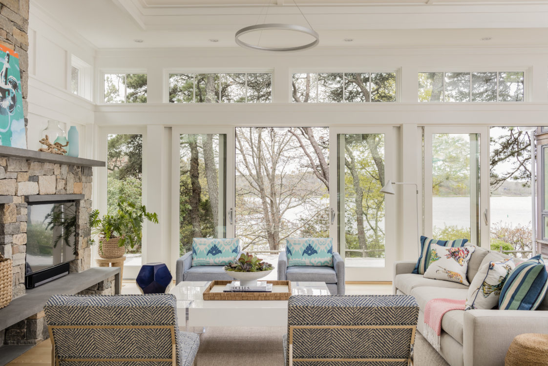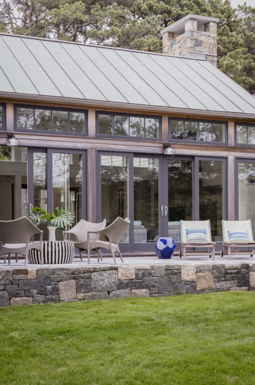 This home was designed to disappear into the landscape, allowing for maximum enjoyment of its waterfront location. Limitations imposed by the local coastal resource commission created interesting design parameters including the use of an existing foundation. Approached from a higher elevation, the main entrance is crowned by a row of transom windows allowing views through the central great room to the water beyond. This feature is continued in a clerestory encircling the entire space, bringing year-round light to the home’s kitchen, dining, and seating areas. The use of natural cedar and local stone enhance the sense of connection with surrounding landscape.