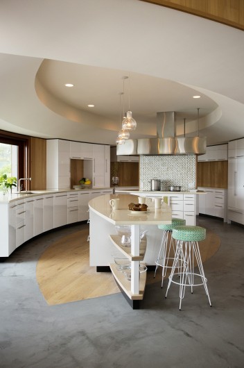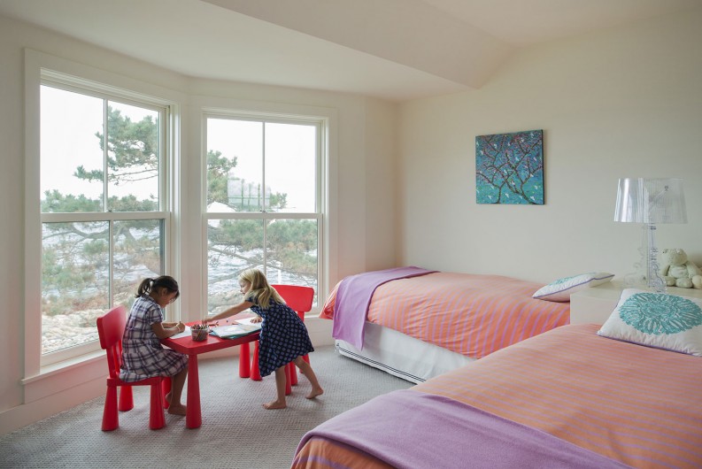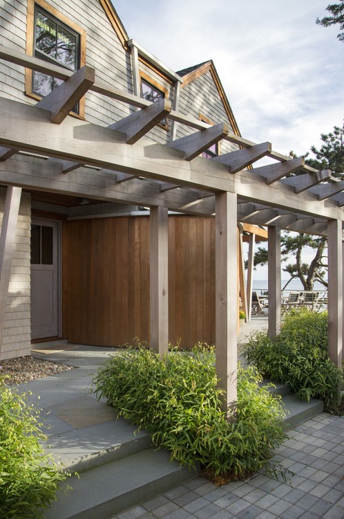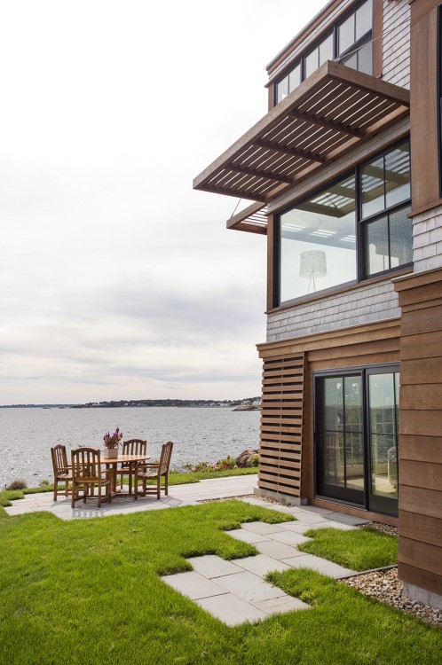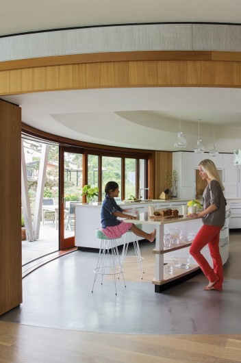 This home on Boston’s north shore makes the most of multi-generational living in a pristine location. The main house features multiple living and play areas, office space, and five bedrooms to accommodate the dynamic needs of a young family. A garden level in-law suite functions independently with abundant natural light, ventilation and water views. The almond-shaped form of the kitchen mimics the natural contours of the shoreline beyond, while hinting at the site’s fishing heritage. Custom curved sliding doors open the kitchen on one side to an elevated deck that invites connection with the ocean. Battered walls in natural wood on the building’s exterior reflect fish-drying racks that littered the coast of the north shore in the past. A brise-soleil provides shade in summer while allowing the winter sun to penetrate deep into the house.