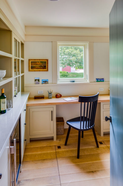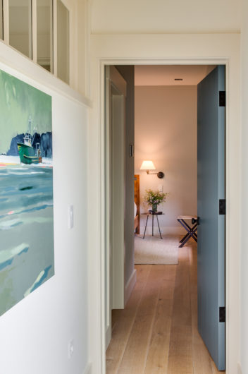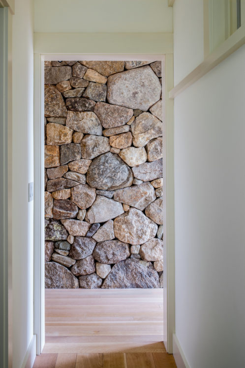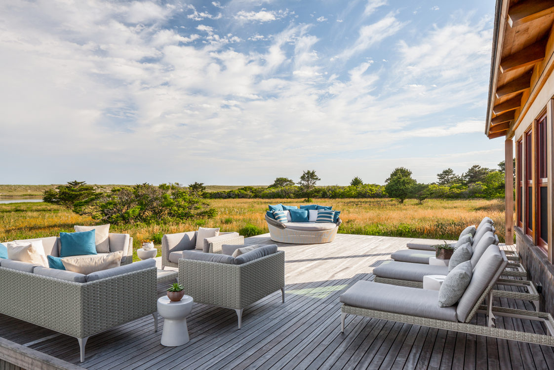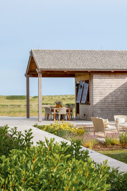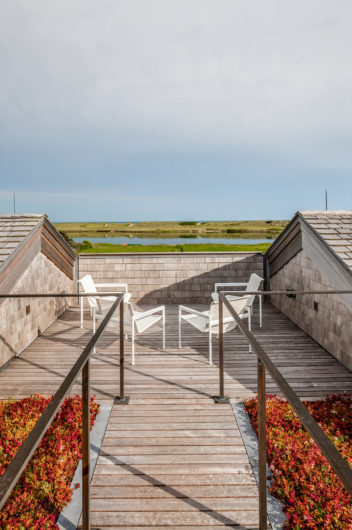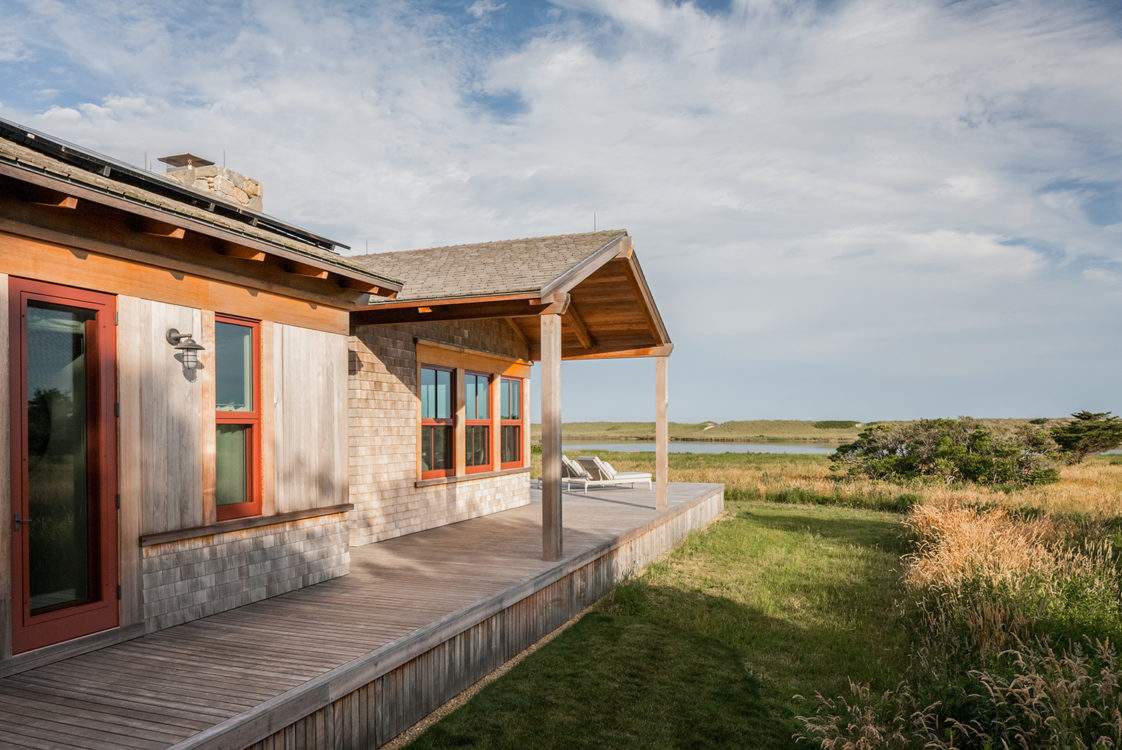 This home, overlooking a saltwater pond and barrier beach with the Atlantic Ocean beyond, had once been the site of an old fishing and hunting camp. Its new owners aimed to create a comfortable family getaway that preserved the essence of the property’s unique history. Working with Hutker Architects, they arrived at a design for a modern beach camp. The main building contains common living and dining areas, as well as a bedroom wing, while the master suite (with private study) is housed in a separate cabin. Throughout the interiors, rough-hewn timbers frame a simple palette of natural materials, selected with the inevitability of harsh sunlight and sandy feet in mind. All structures are raised several feet above grade, perched on a boardwalk that provides circulation between and around the buildings, and via an outdoor stair to a lookout on the roof. Natural cedar and a green roof help to minimize visual disruption between the house and its natural environment, while the simple gabled structures are a nod to the property’s roots.