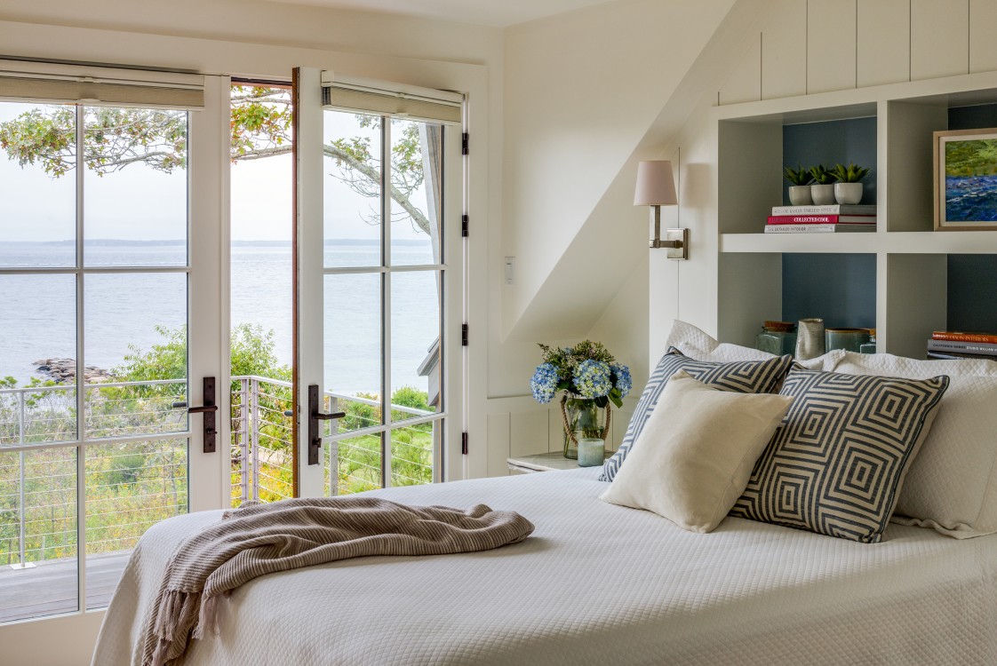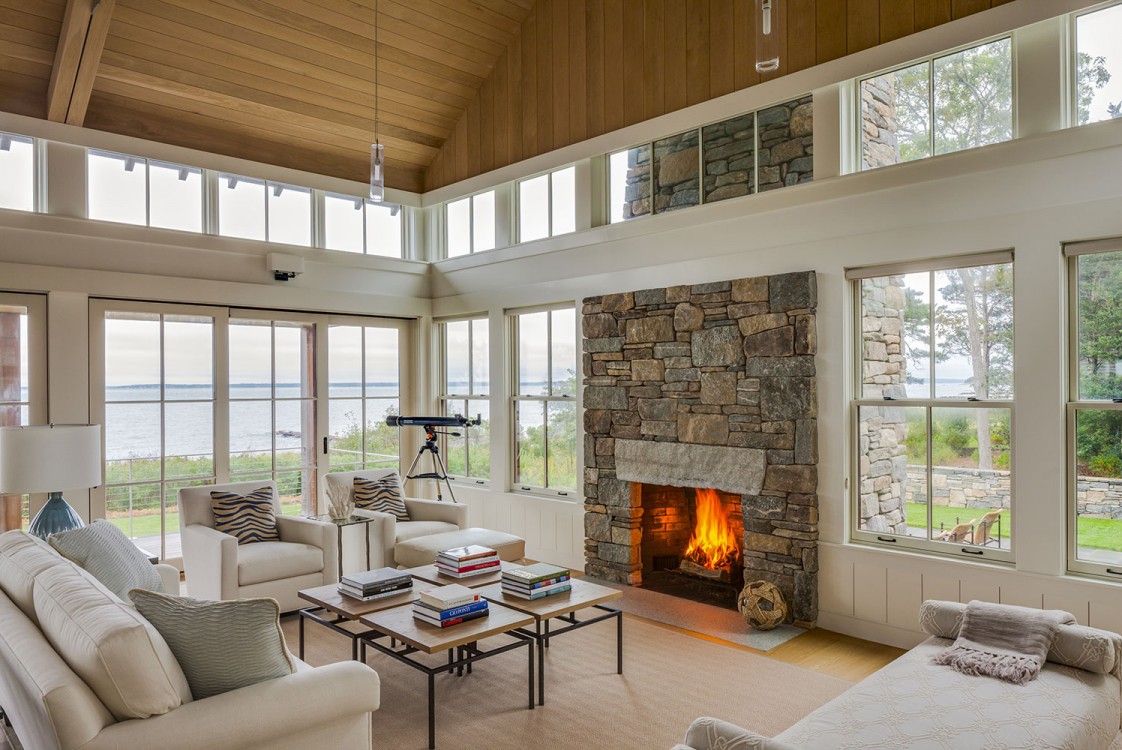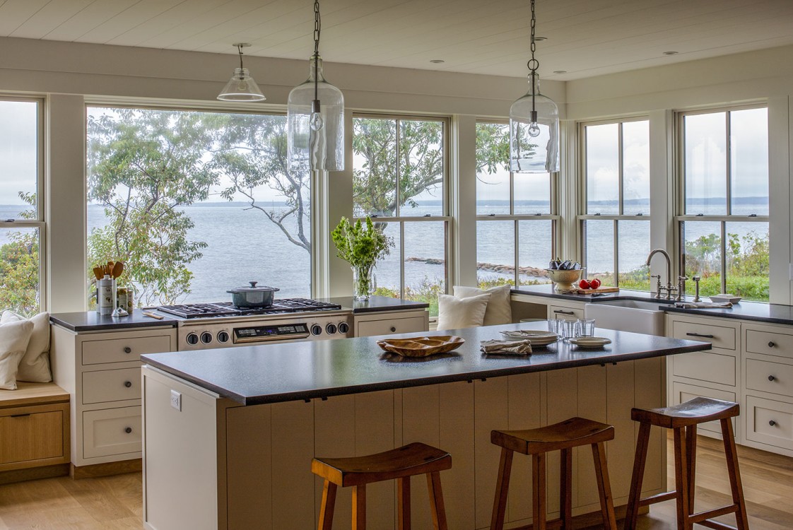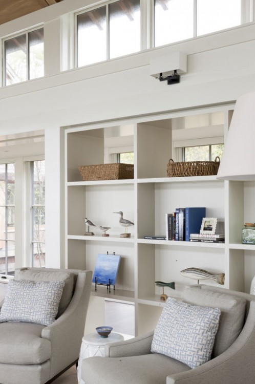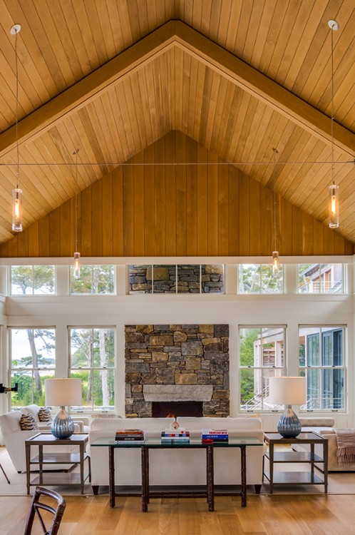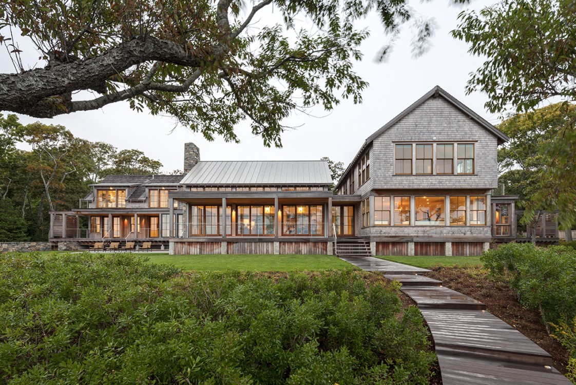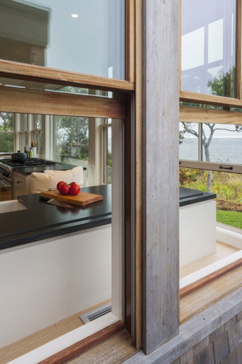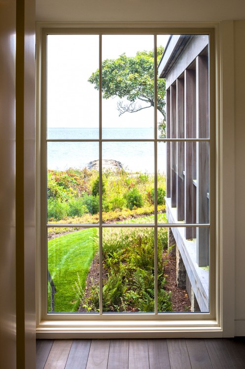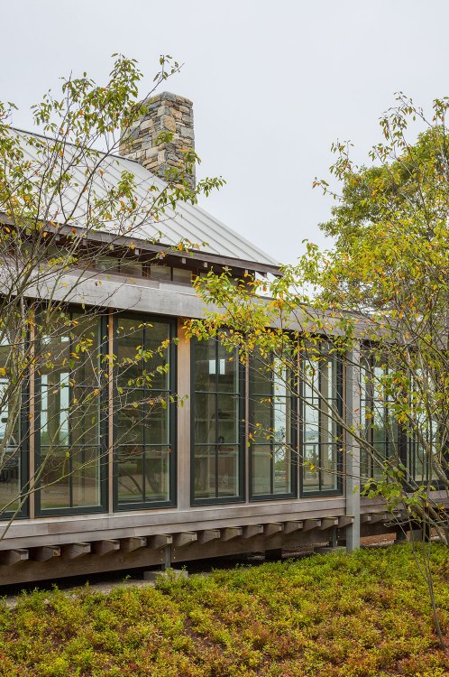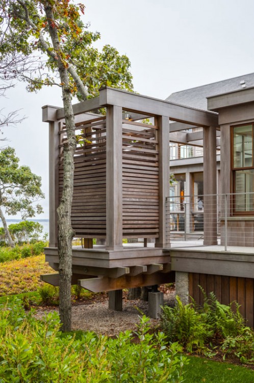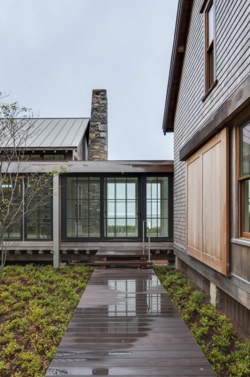 This Cape Cod beach retreat, which includes a barn-like garage and guest suite, is arranged along a light-filled corridor called “the boardwalk” which runs the full length of the main house and terminates in outdoor shower pavilions, cantilevered over the ground, at both ends. The home’s individual rooms are arranged along it and are held back in places to allow for different view experiences. Entrance paths traverse a moat of low lying blueberry in the front yard, intersecting the boardwalk at two points, and extending from the motor court through the residence to the back deck and all the way to the home’s private beach in the rear.