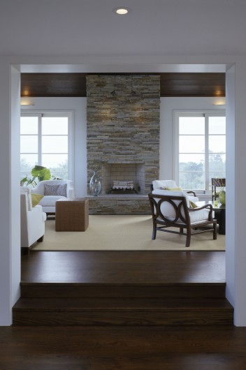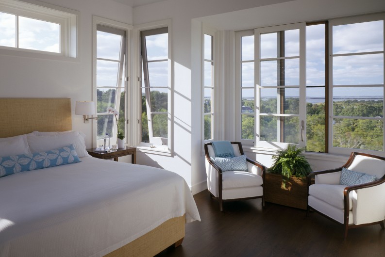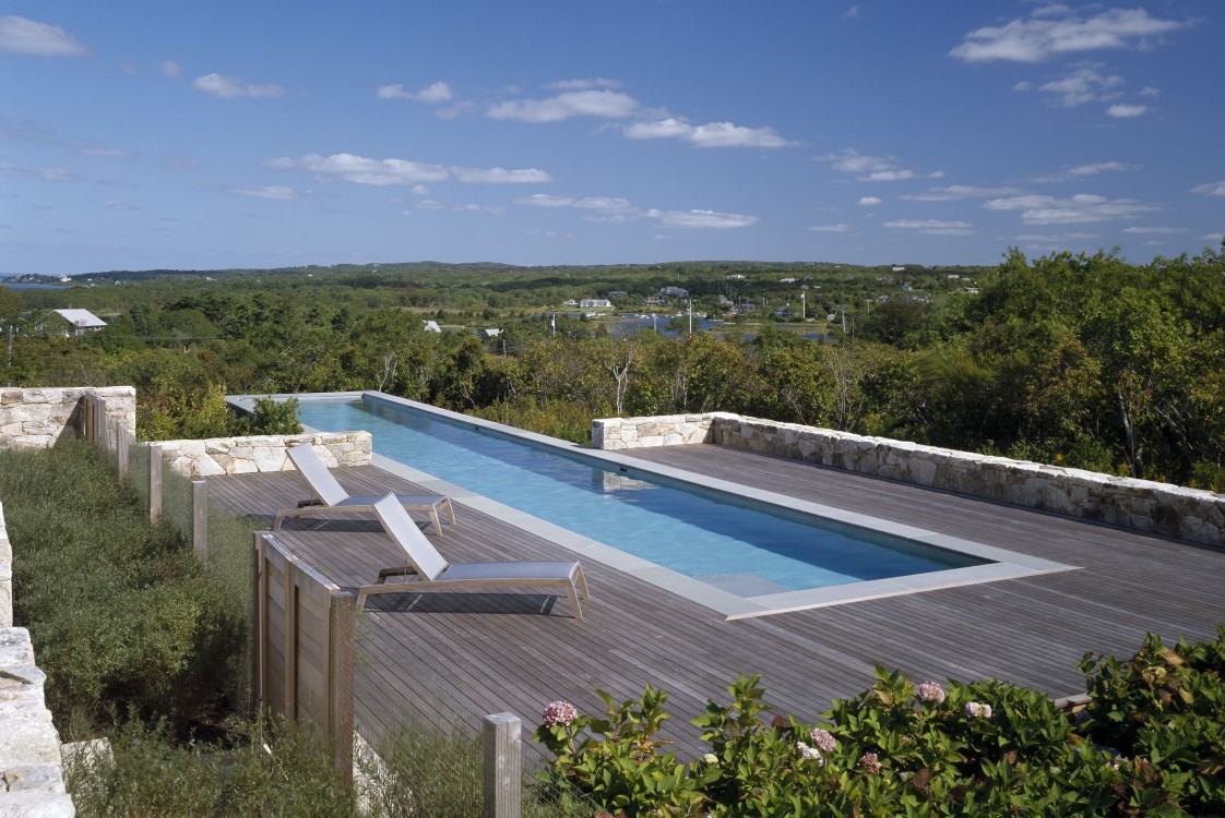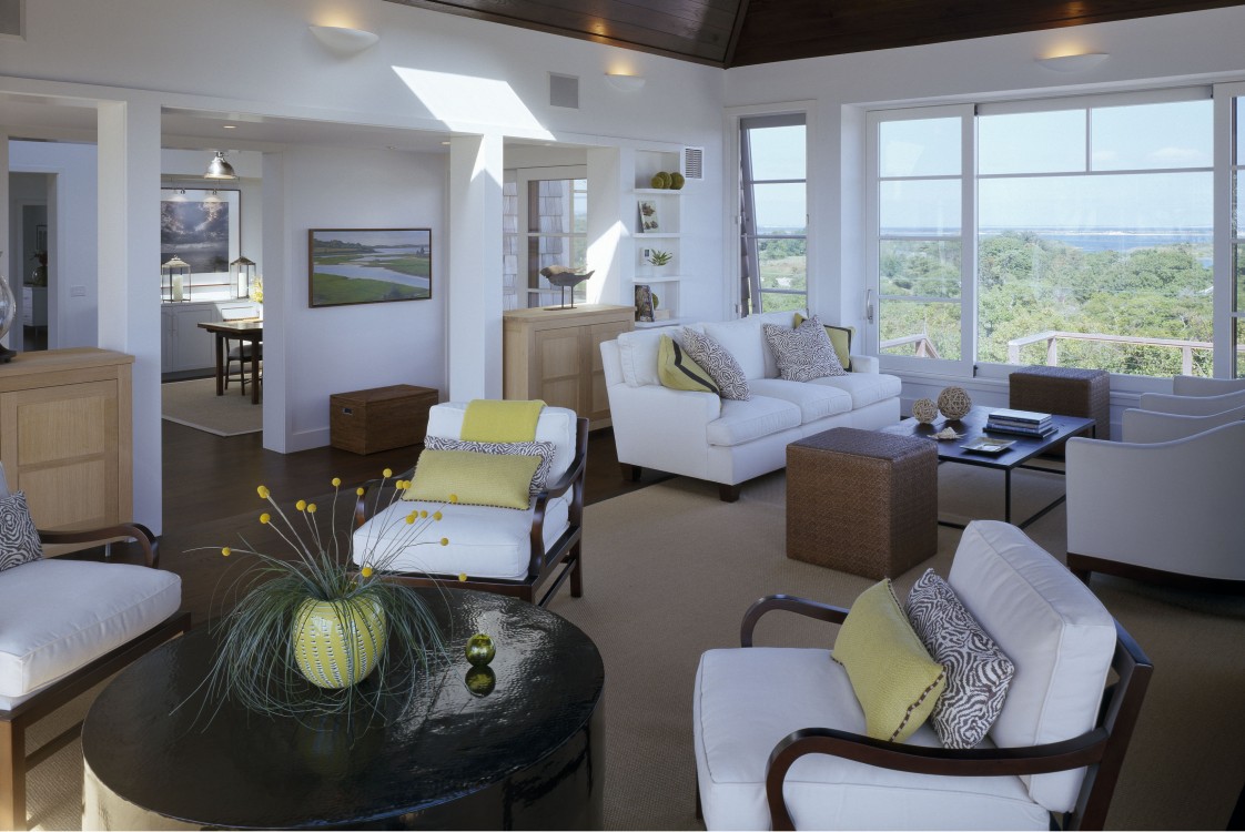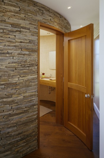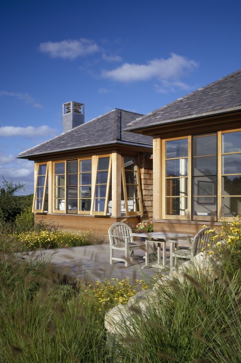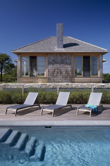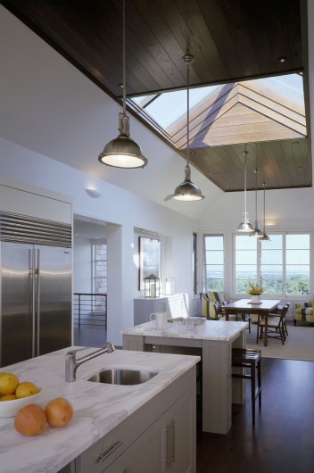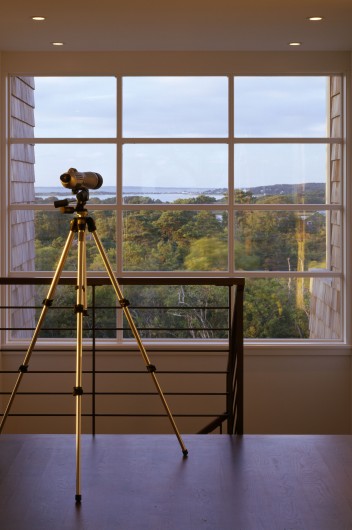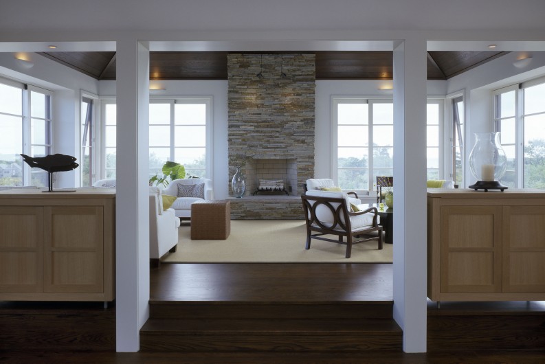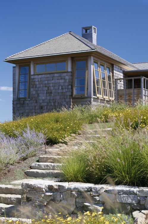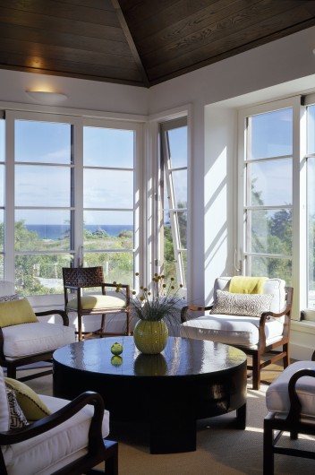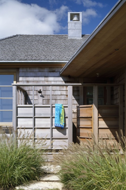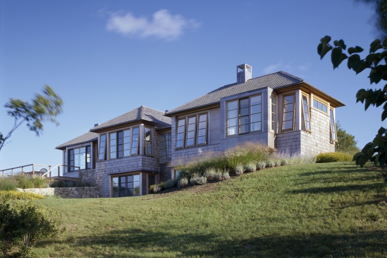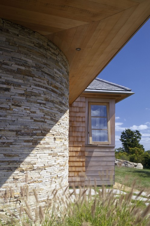 Situated on a hill overlooking Squibnocket Beach, this home responds to 180 degree views of the Atlantic via a series of hip roofed volumes, each incorporating different levels of light and advantaging different vistas. An elliptical stone column, or “sugar mill,” inspired by the client’s travels in the West Indies, serves as the home’s primary entrance and also houses a powder room inside. Clean lines and copious glass details marry with rich wood tones in the walnut-stained floors and ceilings, echoing the Caribbean motif. Meanwhile, weathered cedar and copper on the home’s exterior place the home firmly in its New England context.