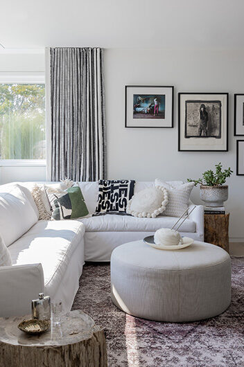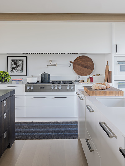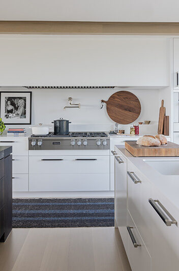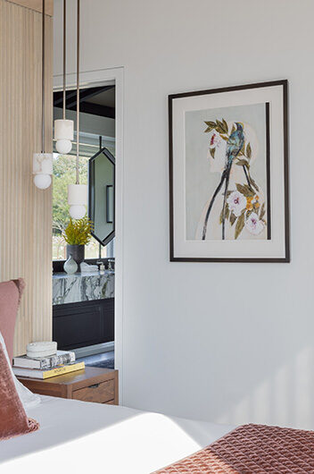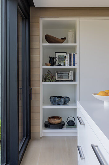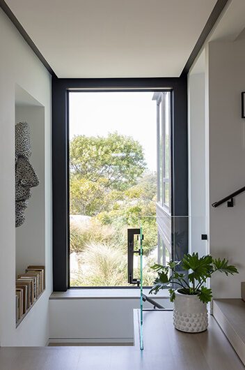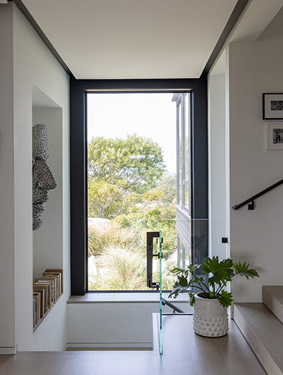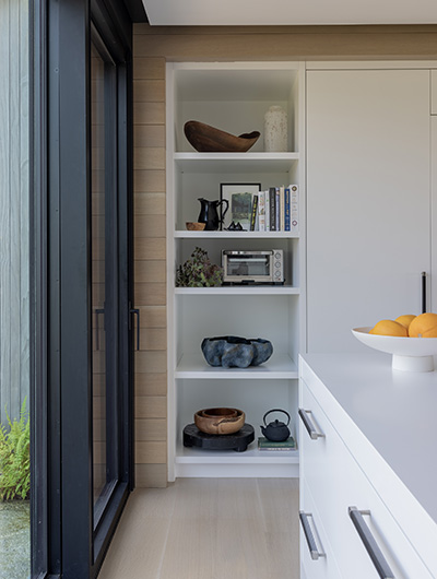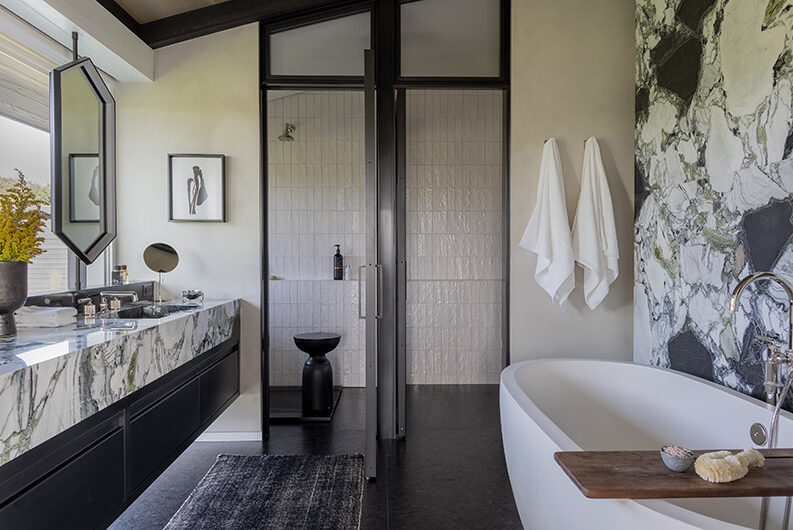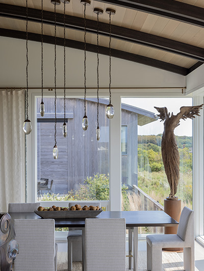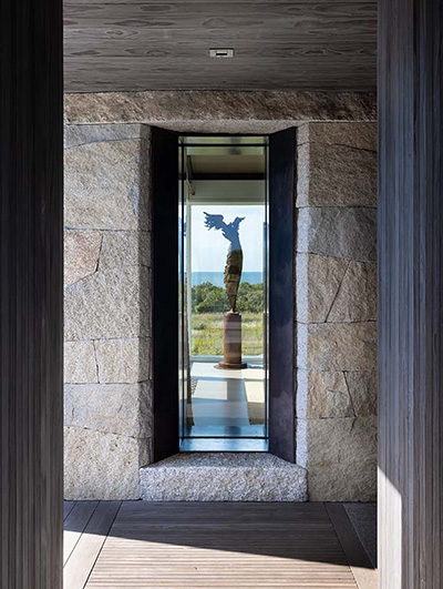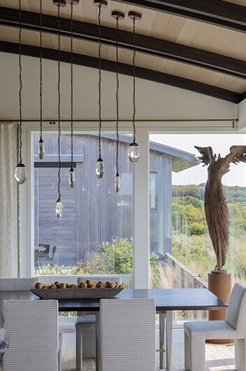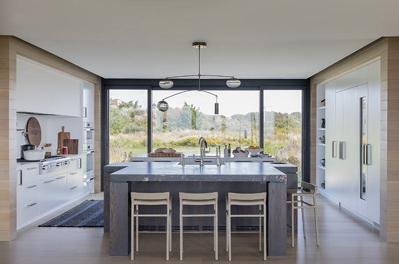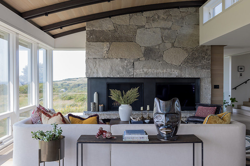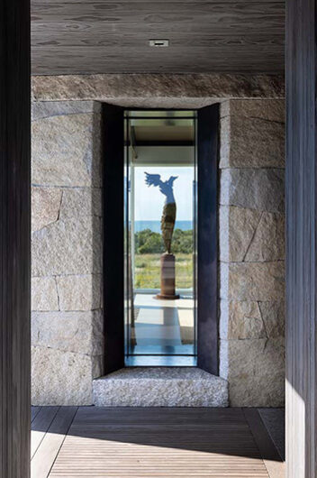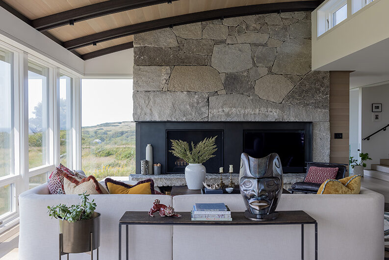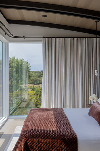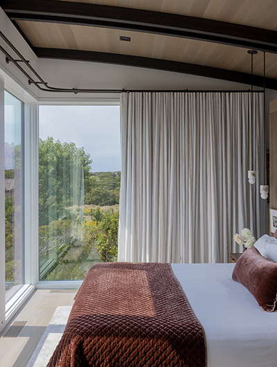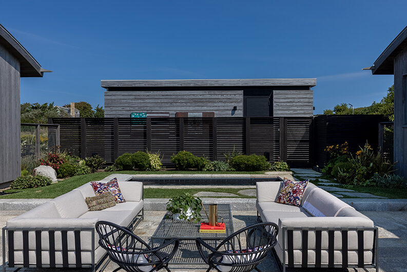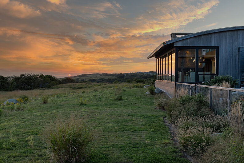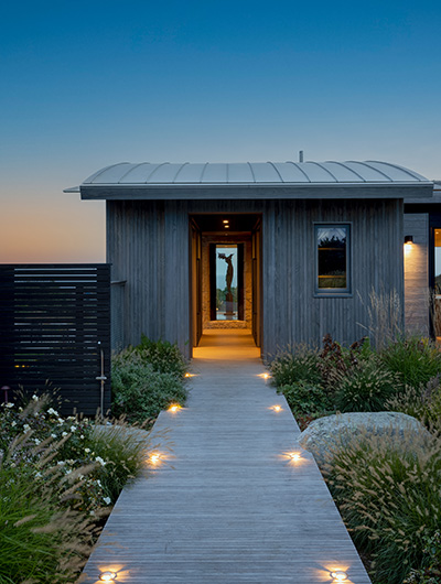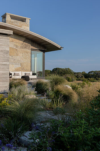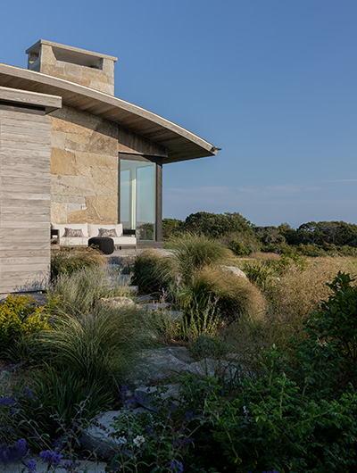 The intent for this Martha’s Vineyard home was to honor the site’s rich history while celebrating its incredible natural beauty. The main house and guest quarters present as geometric volumes that appear to have been pulled apart to create a dynamic series of interior and exterior spaces. Curving, zinc-coated roofs create a series of pods that nestle gently into the hillside. The pods are joined by flat roof connectors clad in a Shou-Sugi Ban finish, reinforcing their quietness and diminutive scale. Inside, a great room is bracketed by two granite boulder walls, which offer a grounding element amidst expansive views of the island’s south shore, Noman’s Island, and the Aquinnah cliffs. A central courtyard with a plunge pool centers outdoor gathering on the views, while the primary suite and guest quarters are designed to maximize connection to the site.