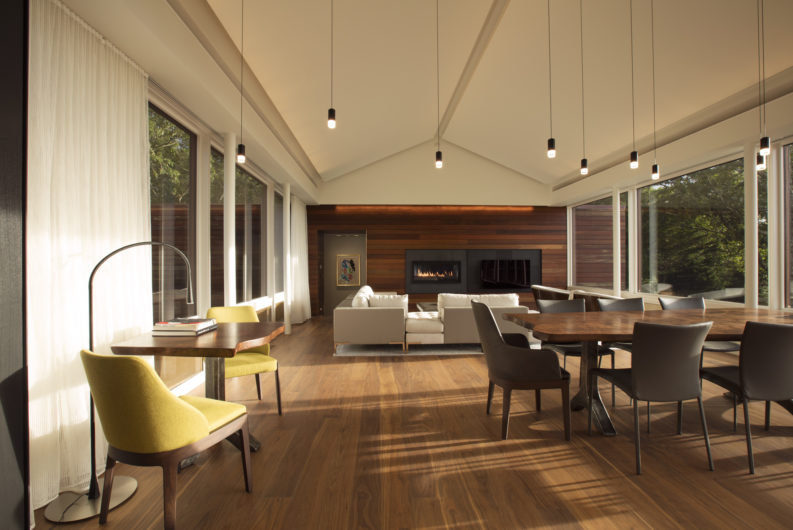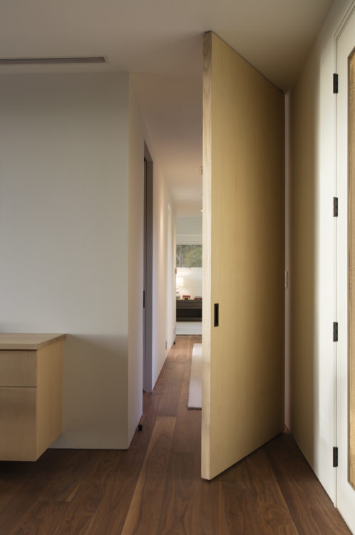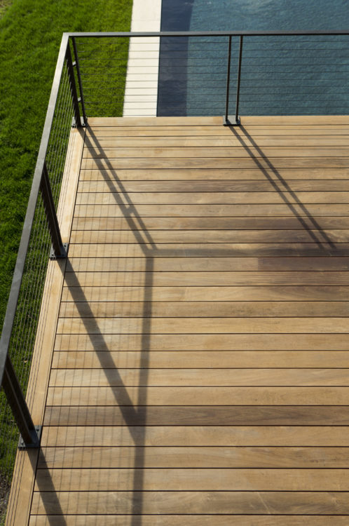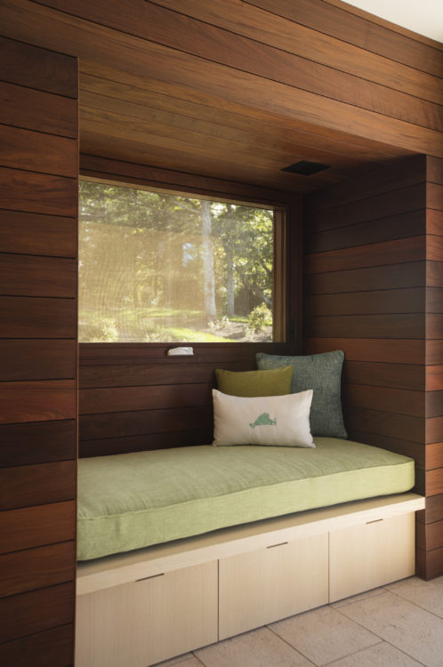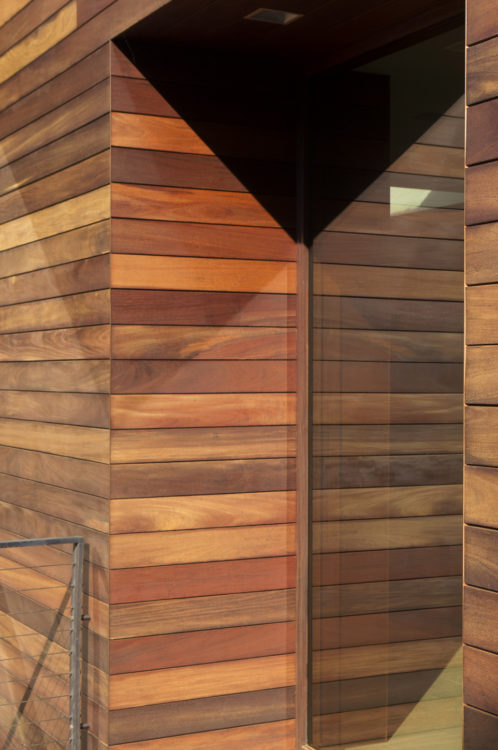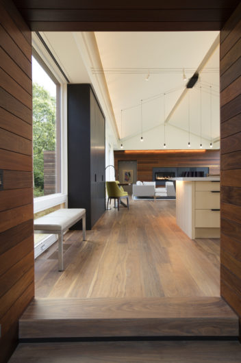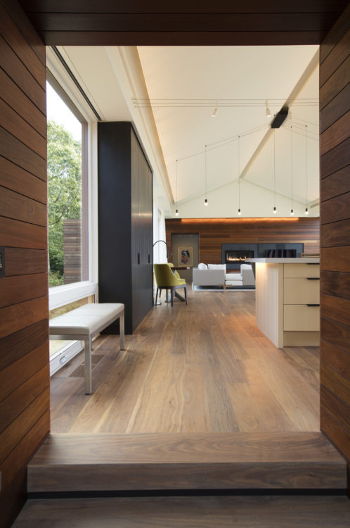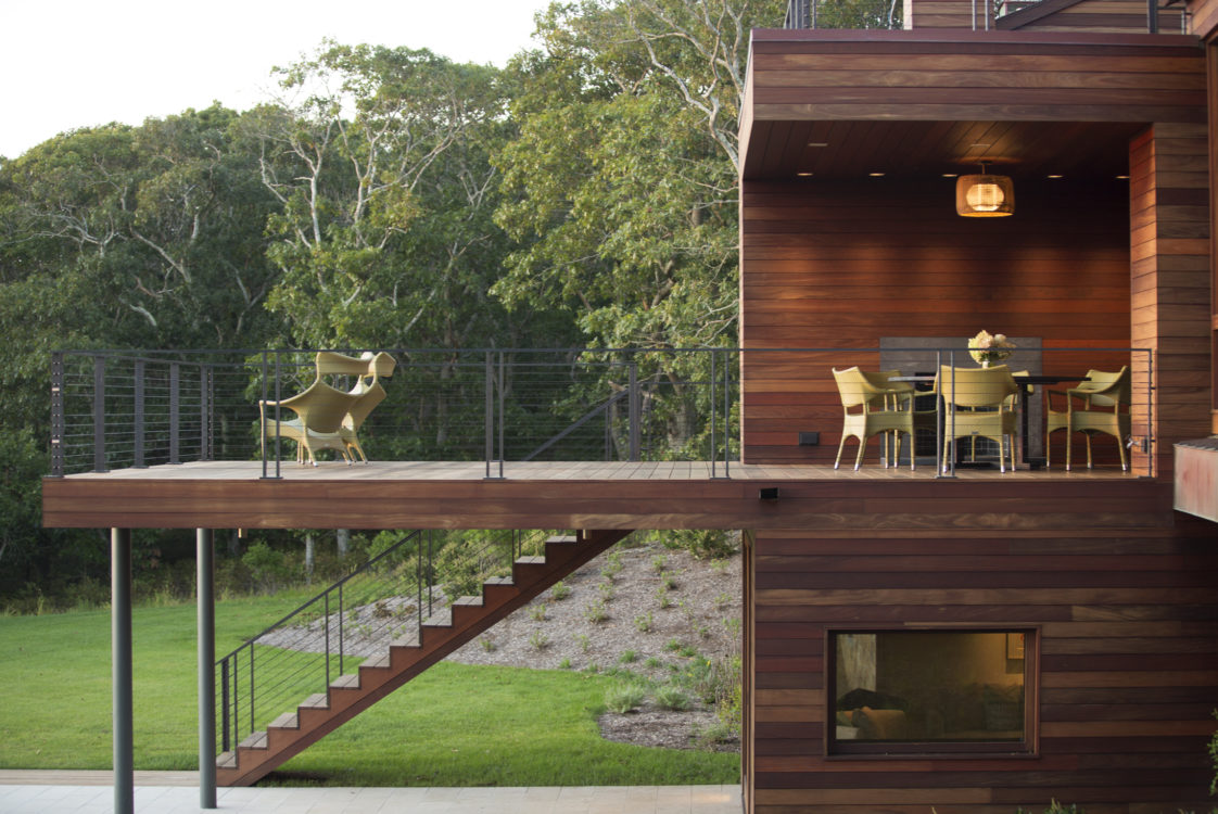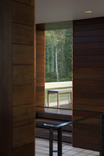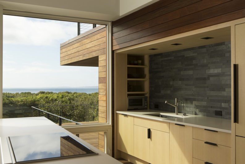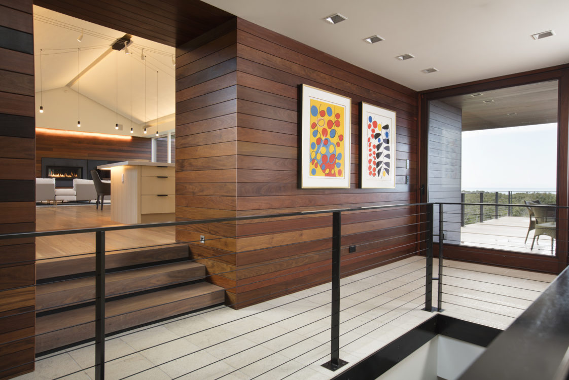 On a hill overlooking the Atlantic, this modern home is designed to maximize experience of the outdoors at every turn. Our team created a concept that would elevate this space in a gabled glass bridge suspended between flat roofed guest and entry wings. Simple materials; oiled ipe wood and bronze, punctuate its geometric forms which are scaled to be in harmony with the home’s natural surroundings.