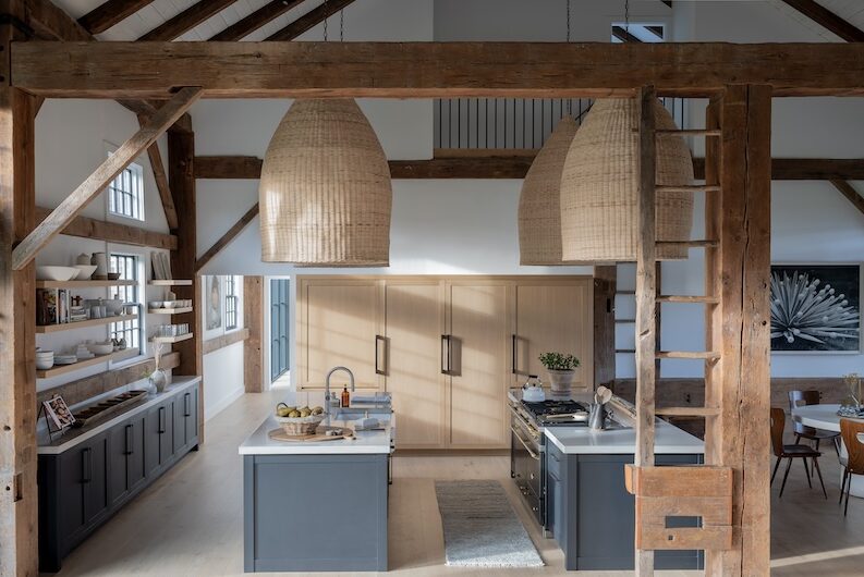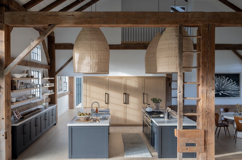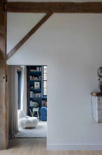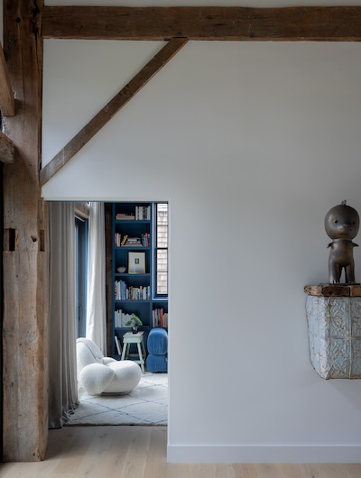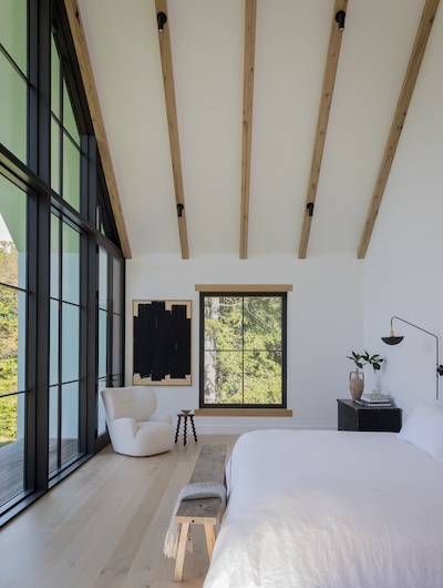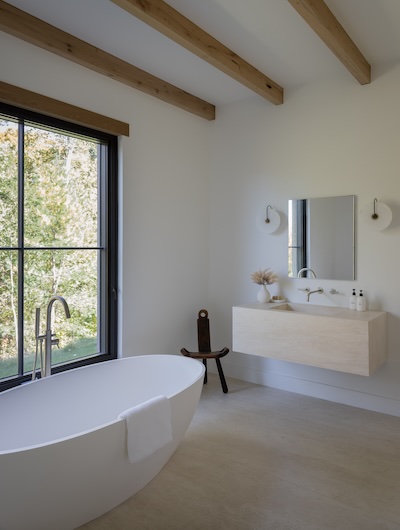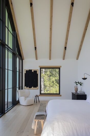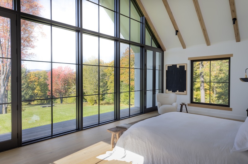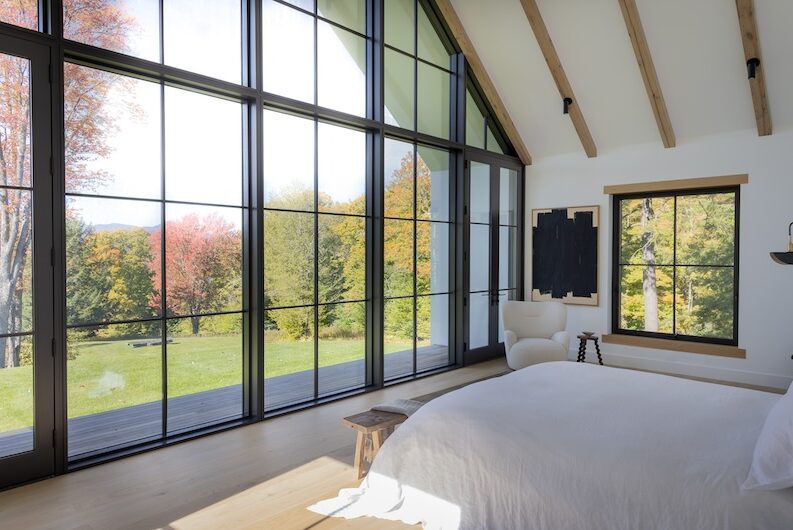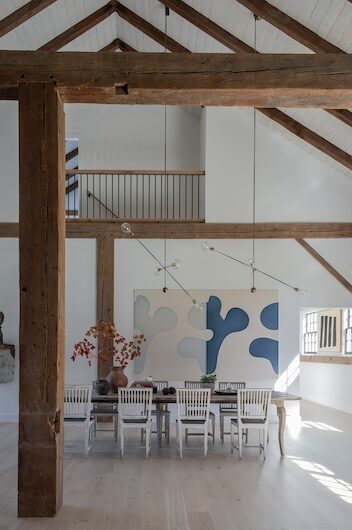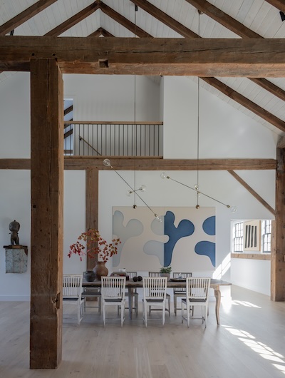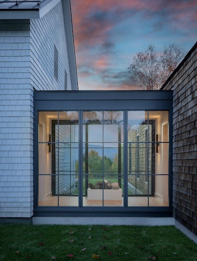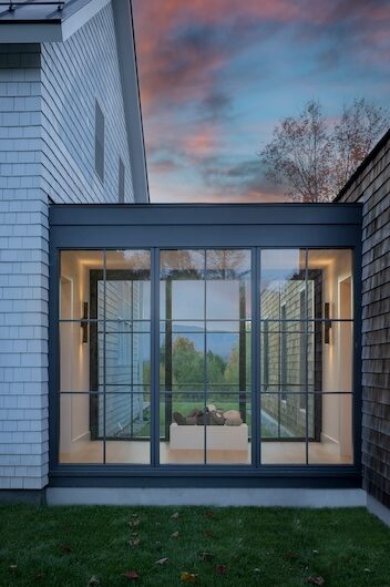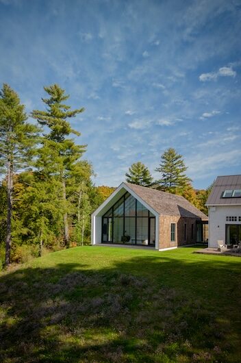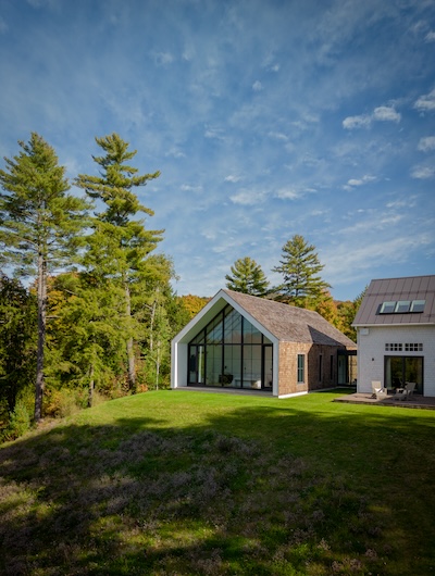Situated in the hills of Stowe, Vermont, this modern farmhouse blends antiquity and newness, a Shaker-like calm of barn-turned-art gallery. Designed as a family refuge, the home offers open rooms and peaceful symmetry. A white color palette, oak flooring, and plastered interior walls pair with rustic exterior features, such as the metal roof and twin sliding barn doors. The central barn serves as the family’s shared living space, with guest suite upstairs, while each wing has its own private domain. Breezeways stand out as connectors to both public and private spaces, putting the natural, meandering view on full display.