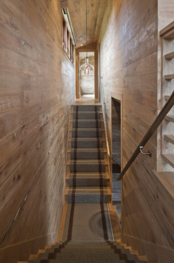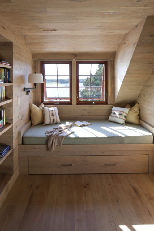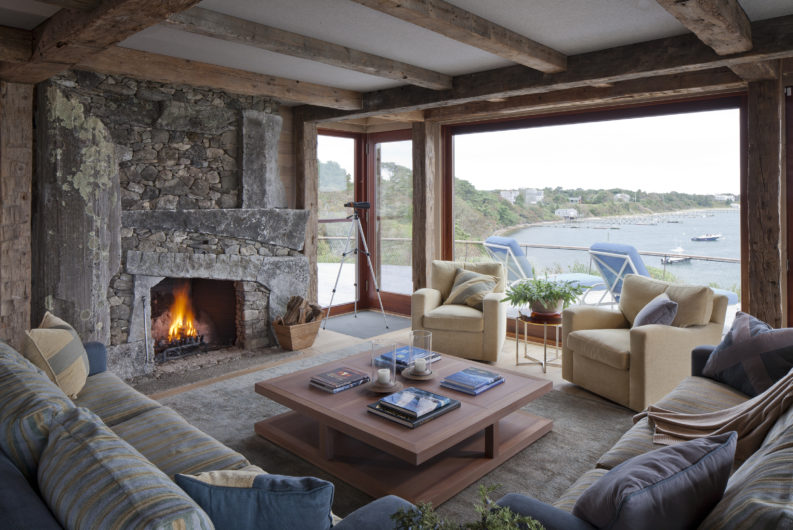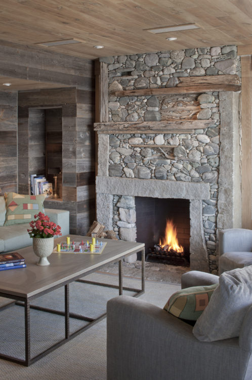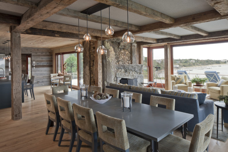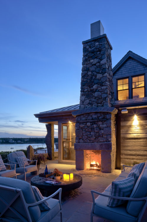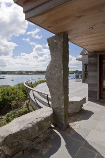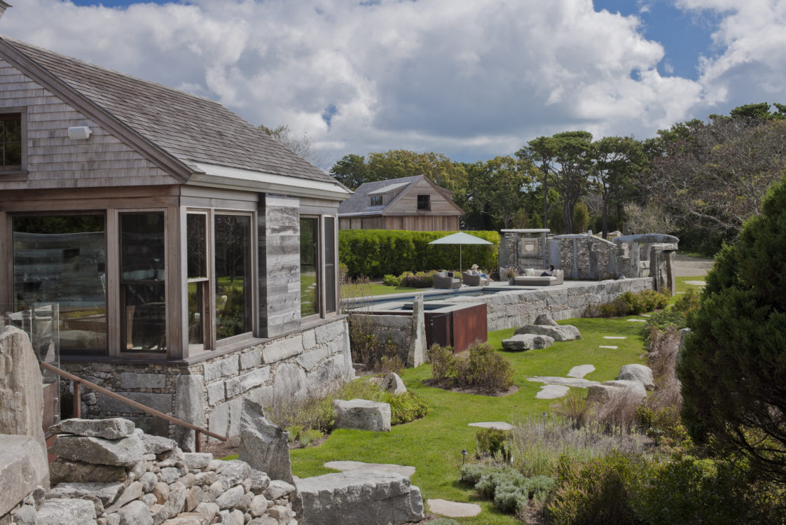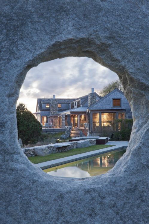 As its name suggests, this home is perched high on a bluff overlooking Edgartown Harbor. A family retreat reminiscent of a European hilltop village, the main house connects to outbuildings, pool, and private dock below through a series of rustic foot paths, gardens, and landscape features. Details within and without were designed to highlight the organic shapes and textures of natural materials, perhaps most notably in the home’s outdoor pool grotto and in its living room fireplace, which appears to have been pieced together from twigs, pebbles, and branches gathered from the surrounding woods.
