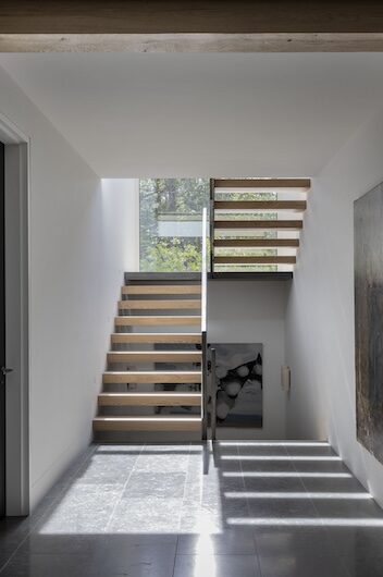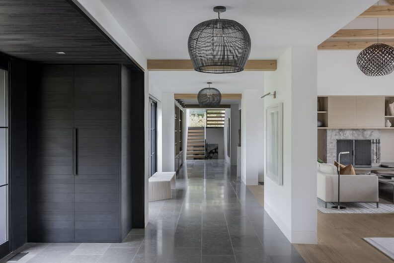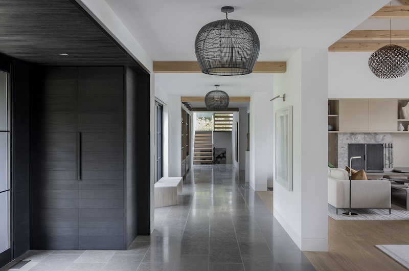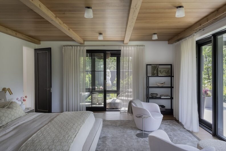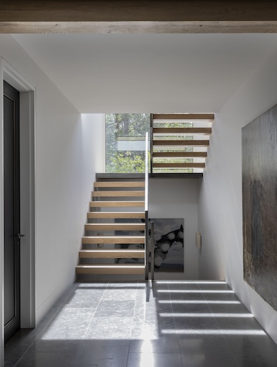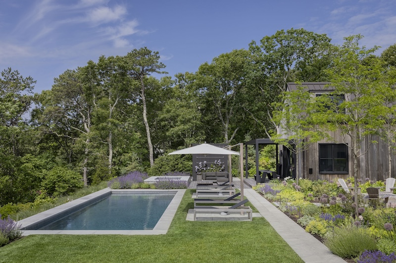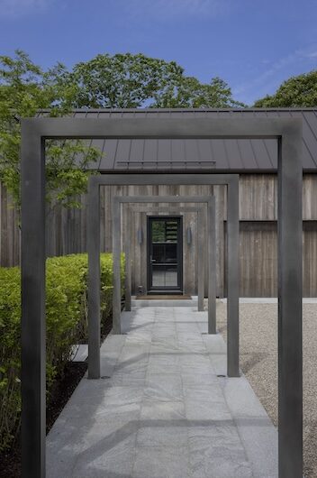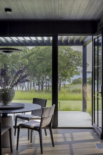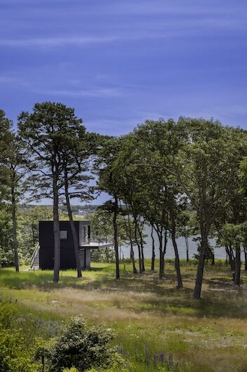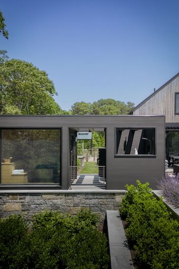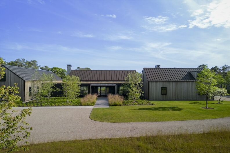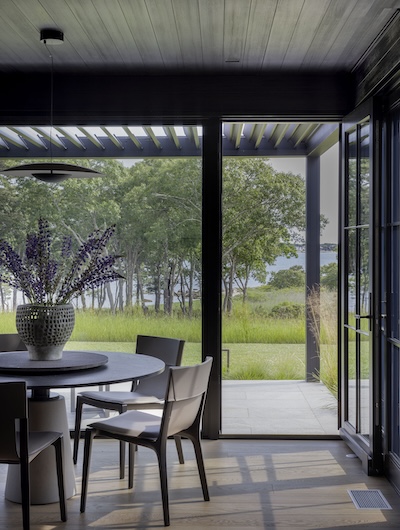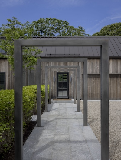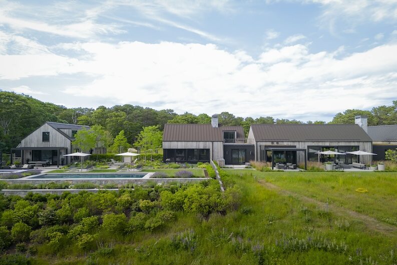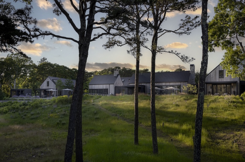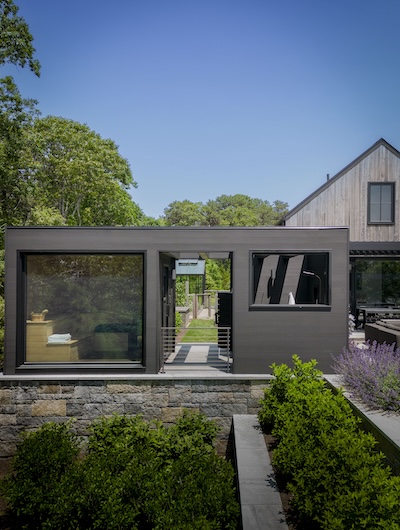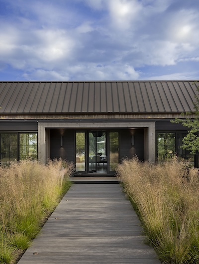 The inspiration for this home is rooted in the history of its place. Located within a secluded pastoral landscape overlooking Buzzard’s Bay, the property had once been the location of a summer retreat that burned down in the 1940’s and was never rebuilt. Only the original foundation was evidence of what once existed. Natural and man-made materials gathered from the site created the palette of texture and color that helped guide architectural decisions moving forward. Designed to connect seamlessly with the outdoors, four gabled volumes connected by a flat-roofed circulation corridor comprise the main house. Oversized windows and doors encourage frequent enjoyment of the home’s meadow setting and evening sky. The interior was designed to create ample gathering spaces for family togetherness as well as areas of respite for quieter times. Environmental features include geothermal heating, and cooling, radiant tubing beneath the metal roof to warm the pool and domestic hot water, as well as suitable greenery for all flat-roofed elements. There is a nice balance between the rustic association of materials and forms used, and simple, understated details, that breathes a modern aesthetic into this special space. |