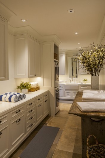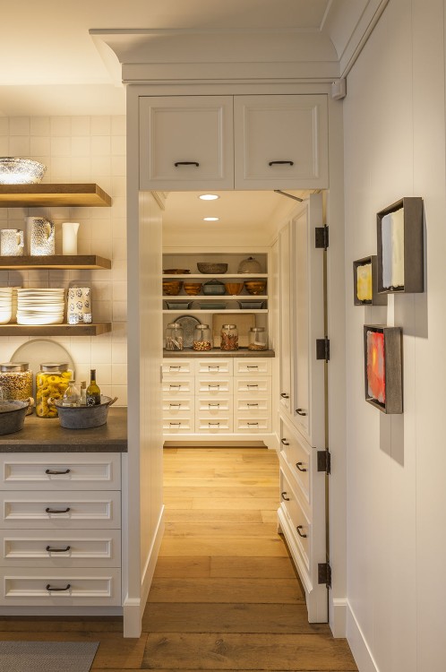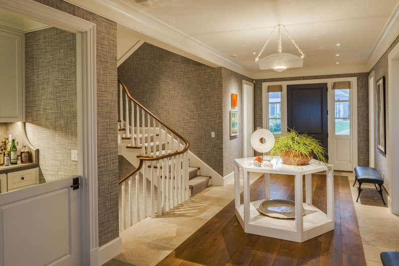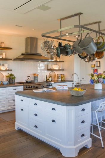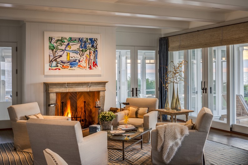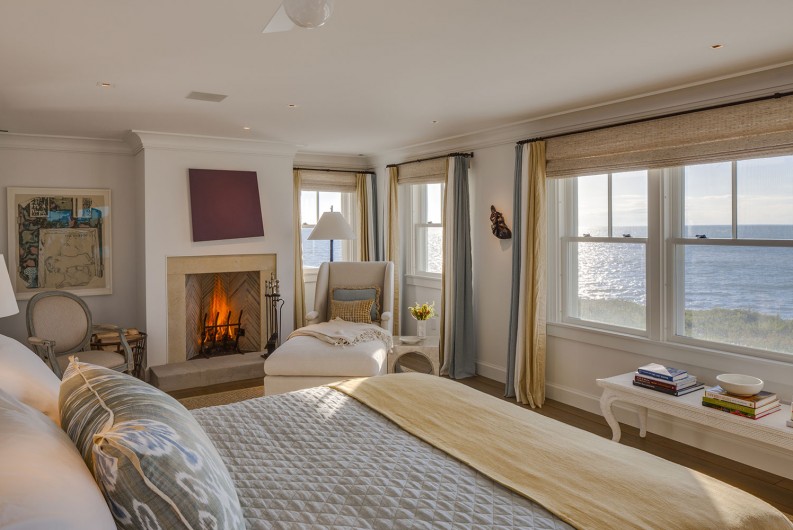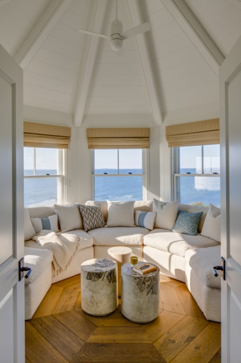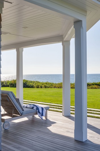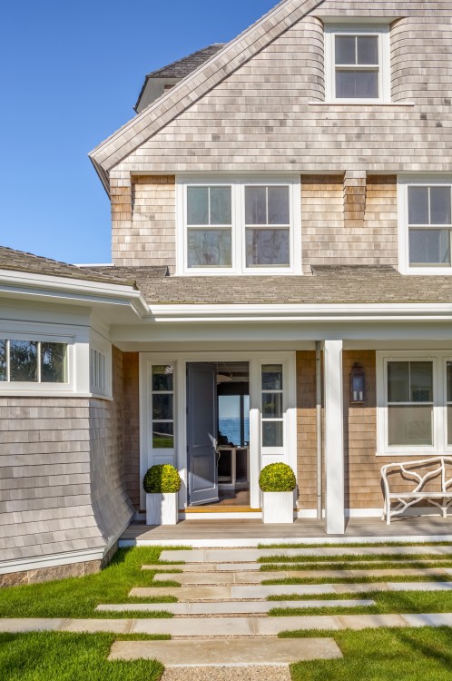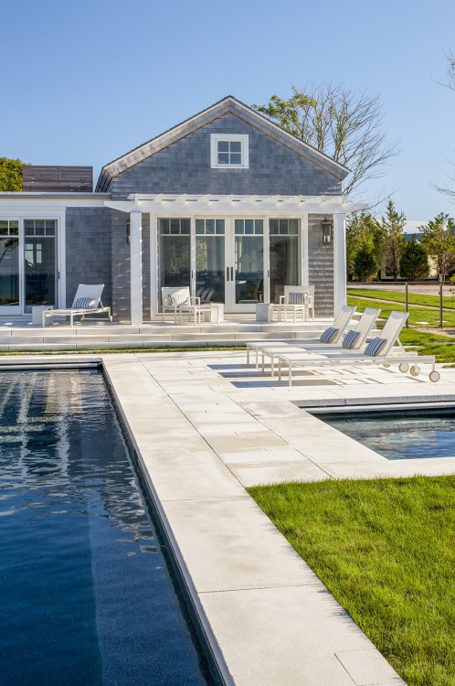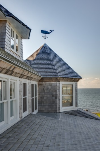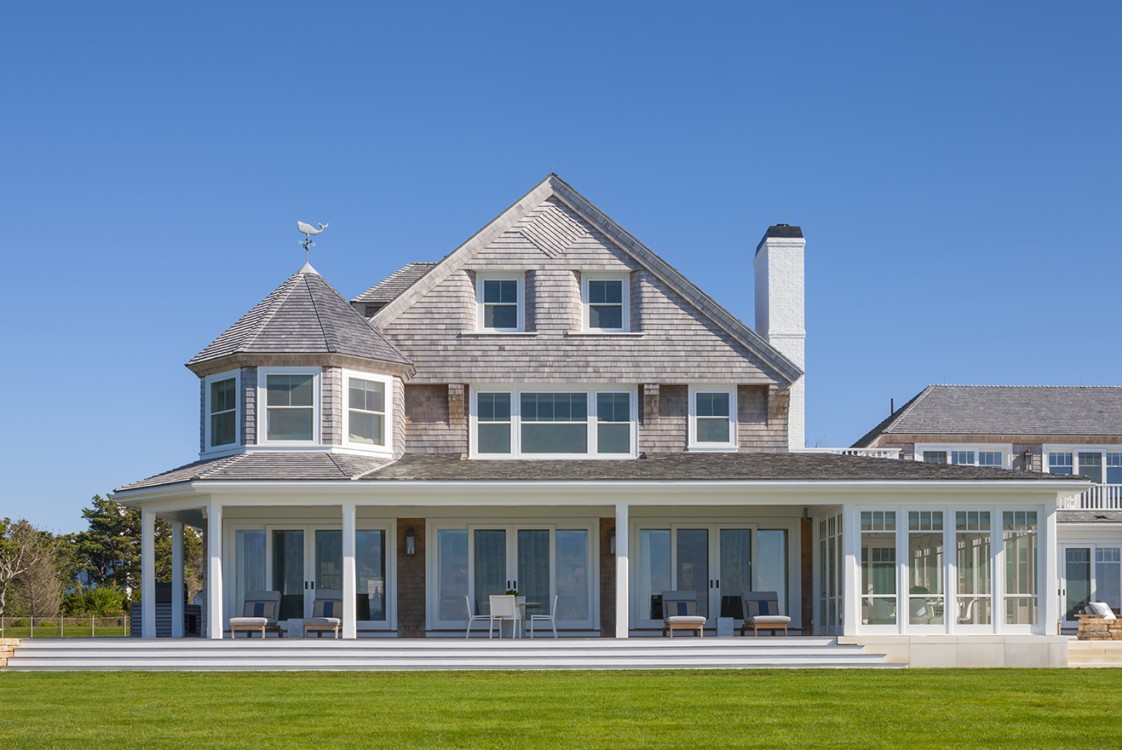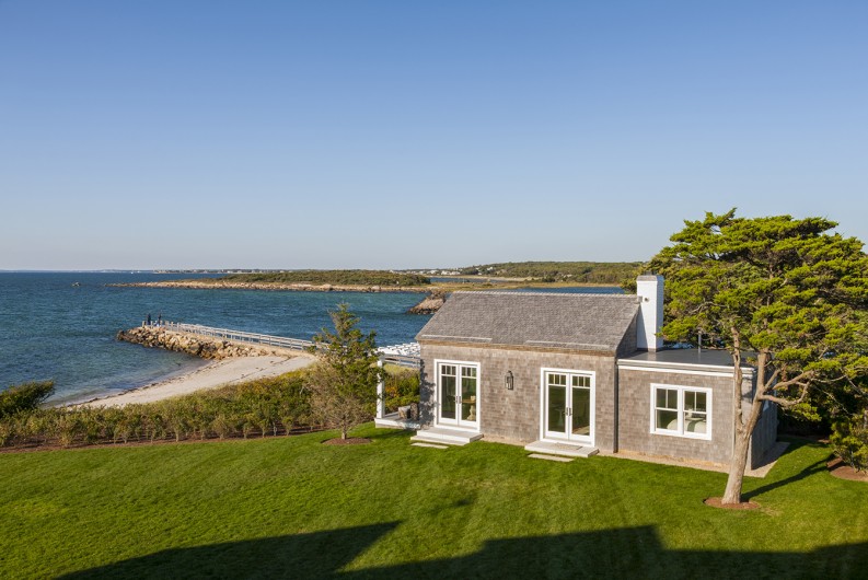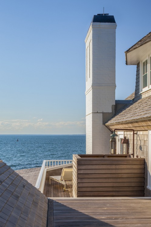 This significant renovation was the fulfillment of a longtime dream for a client who had fond childhood memories of vacations spent on an idyllic and historic Cape Cod enclave, tucked away from tourists and traffic. Details from the original cottage, such as angled hip dormers, a turret on the water-facing facade, and an unusual shingled rake board, were incorporated into a more boldly scaled plan that features a family-sized kitchen, and open living areas suitable for entertaining. A new two-story carriage house, pool house, and boat house were also added. From the hidden rooftop shower to an exercise room which opens to a gracious pool patio, and a wraparound deck connecting the main house to an outdoor living room complete with fireplace terrace, the design connects indoors and outdoors at every level.