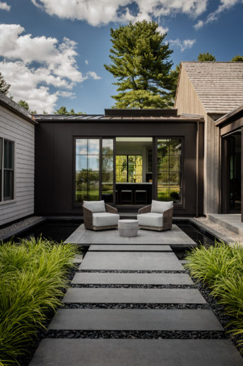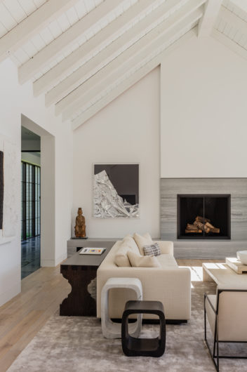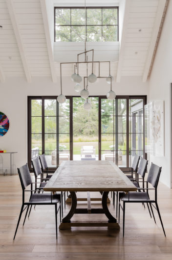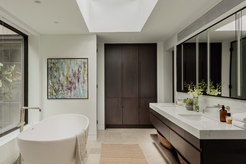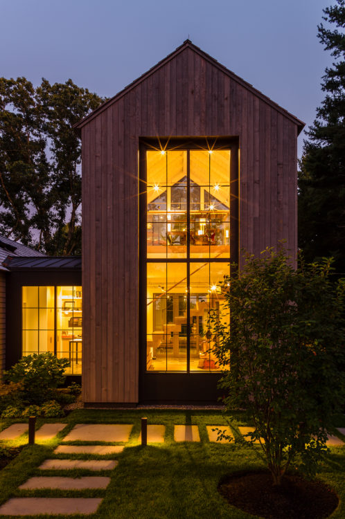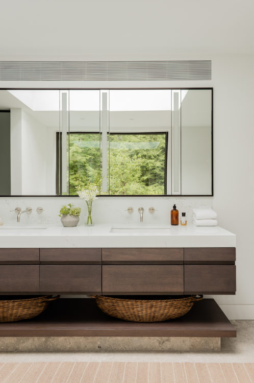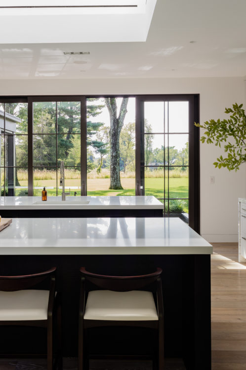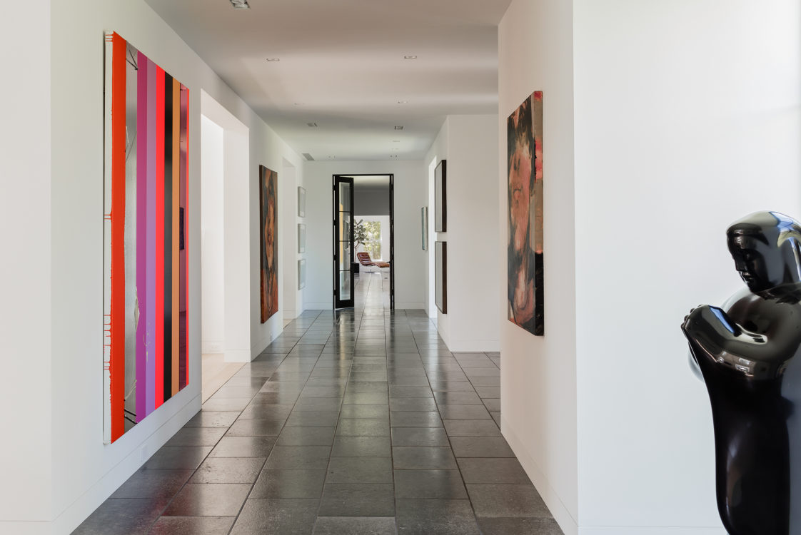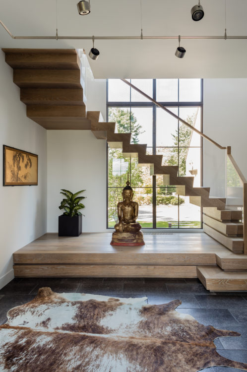 This home was designed to connect seamlessly with the outdoors while providing ample space to display a family’s incredible collection of contemporary art. Additionally, the clients wished for ample gathering spaces in the living and kitchen areas to spend time with their extended family. From entry, a gallery corridor runs the full width of the home, allowing for unobstructed viewing of paintings and sculpture while creating a circulation spine along which the home’s public and private spaces are aligned. Over-sized windows, skylights, and a water feature adjacent to the kitchen encourage frequent enjoyment of the home’s spectacular woodland setting.
